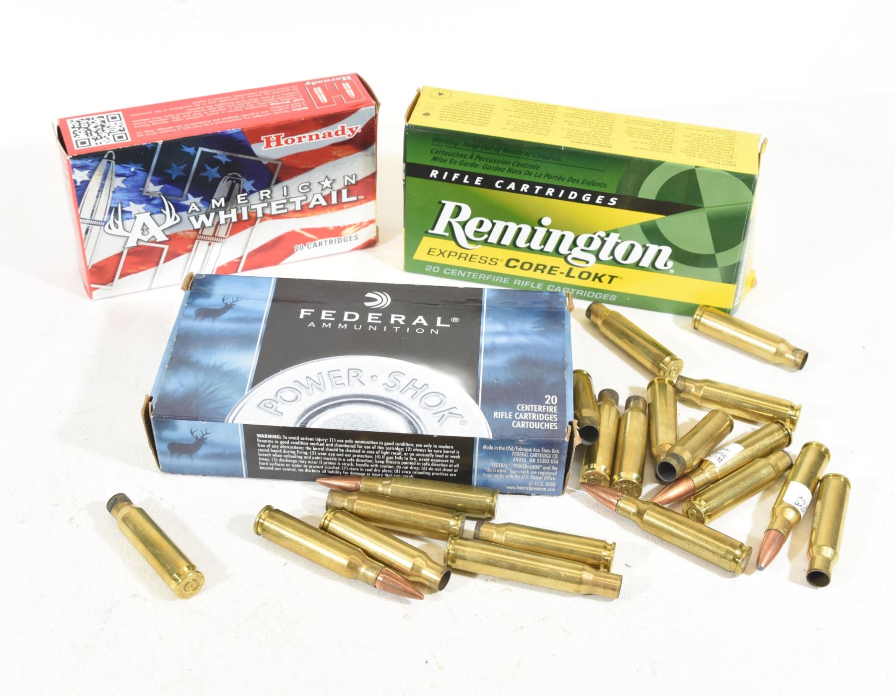 17-round box of Federal Power-Shok 308Win 180gr Soft Point ammunition. 12-round box of Hornady American Whitetail 308Win 150gr InterLock ammunition. 17-round box of Remington Express Core-Lokt 308Win 180gr PSP ammunition. 5 loose rounds of miscellaneous 308Win reload ammunition. 14 loose pieces of miscellaneous 308Win brass. Loose piece of 30-06SPRG brass.