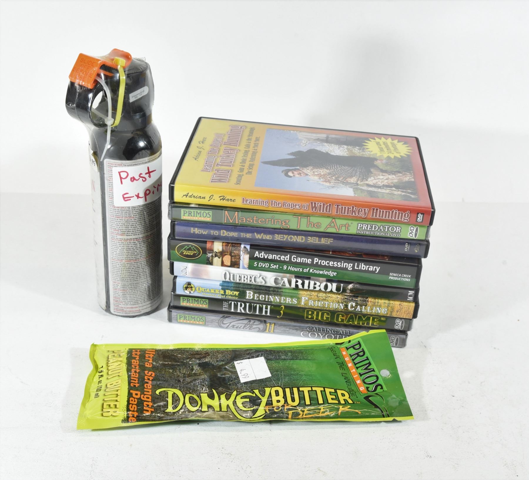 1) Frontiersman Bear Attack deterrent (expired). 2) Primos Donkey Butter deer attractant paste. 3) Advanced Game Processing Library. 4) Quebec's Cruising for Caribou. 5) Beginners Friction Calling. 6) Primos Hunting 3Big Game. 7) Primos Hunting Calling all Coyotes. 8) Primos Hunting: Mastering the Art Predator Hunting. 9) Wild Turkey Hunting. 10) How to Dope the Wind Beyond Belief.
