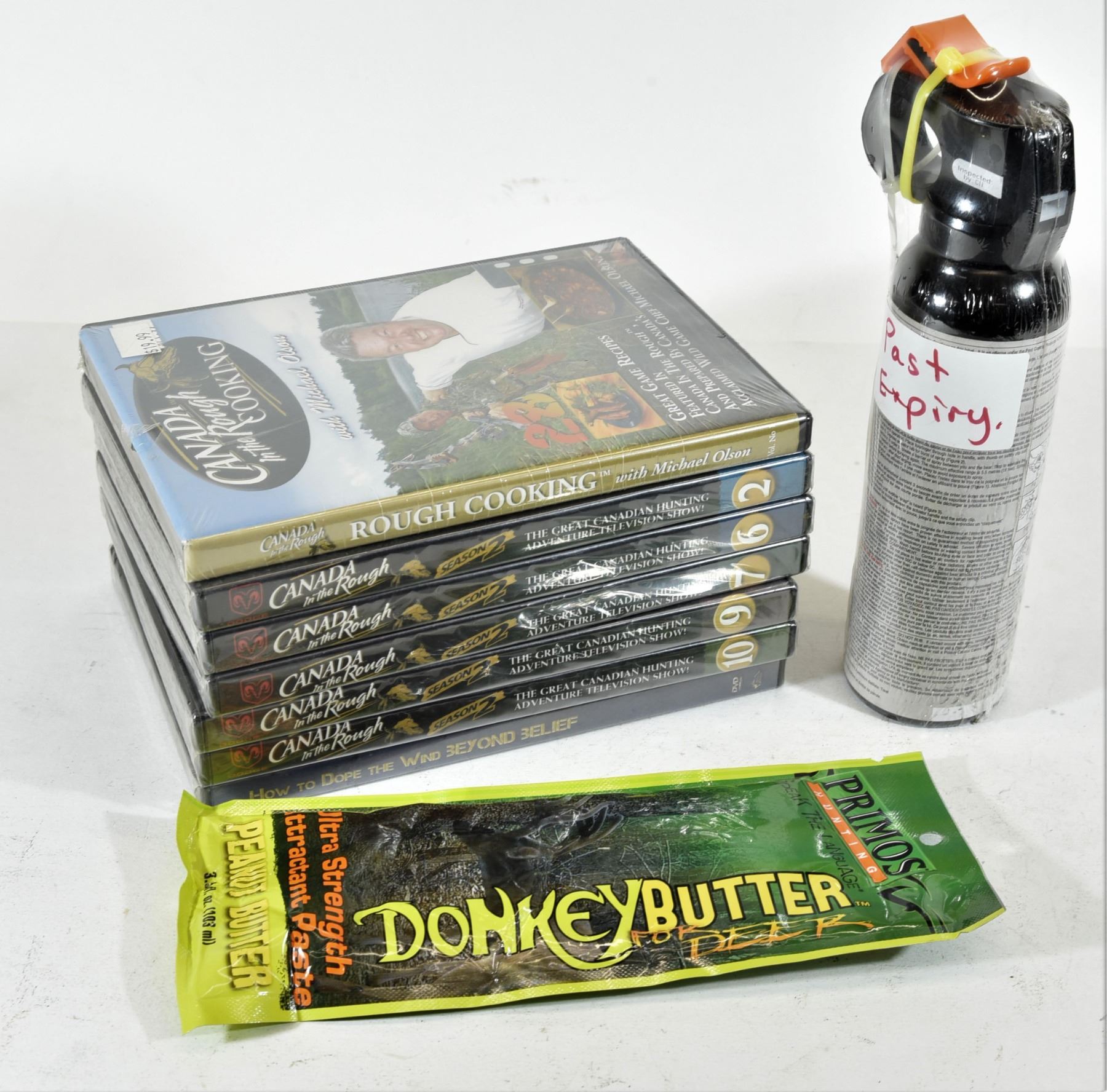 1) Frontiersman Bear Attack deterrent (expired). 2) Primos Donkey Butter deer attractant paste. 3) Canada in the Rough Season 2 episodes 2, 6, 7, 9, 10. 4) Canada in the Rough cooking edition. 5) How to Dope the Wind Beyond Belief