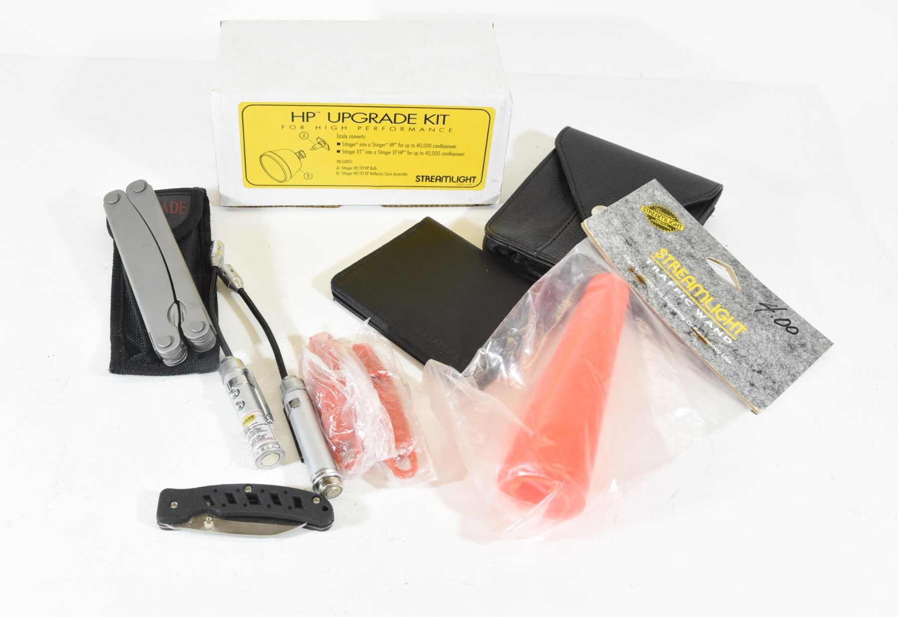 Two laser/bore lights, 3" folding knife, two whistles, traffic wand, Renegade multi-tool, leather pouches and HP upgrade kit.