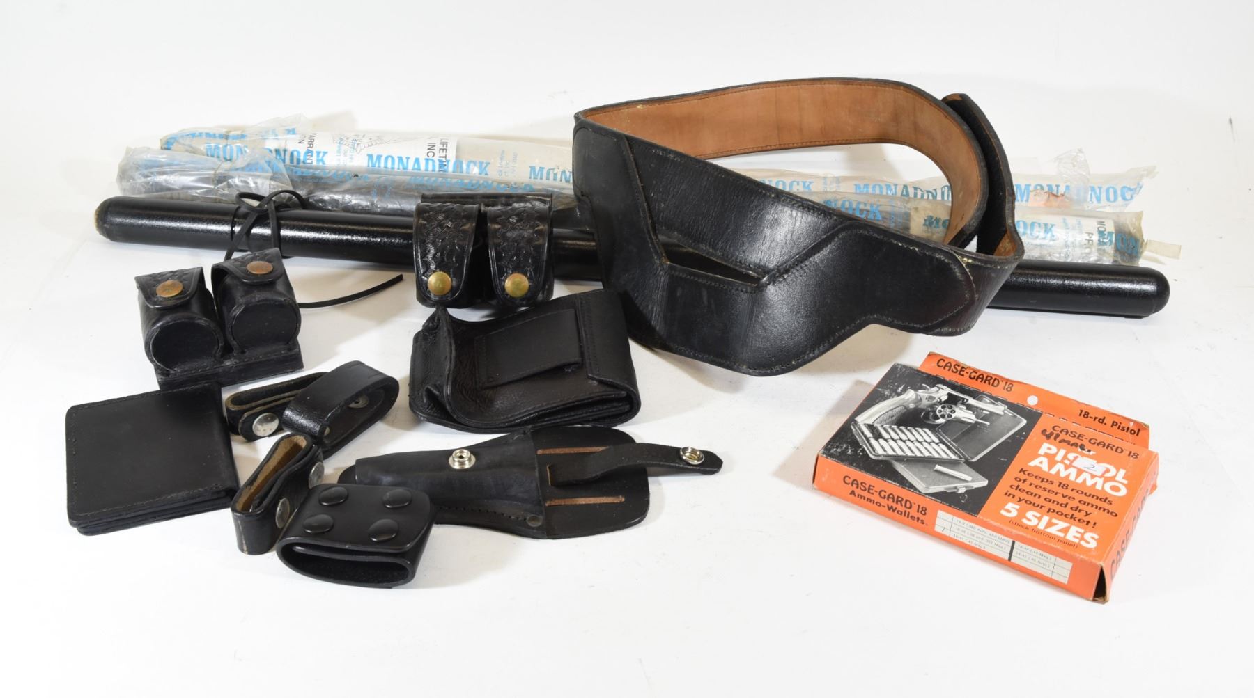 Tactical belt, two billy sticks, ammo wallet, speed loader pouches, leather loops, leather pouches.