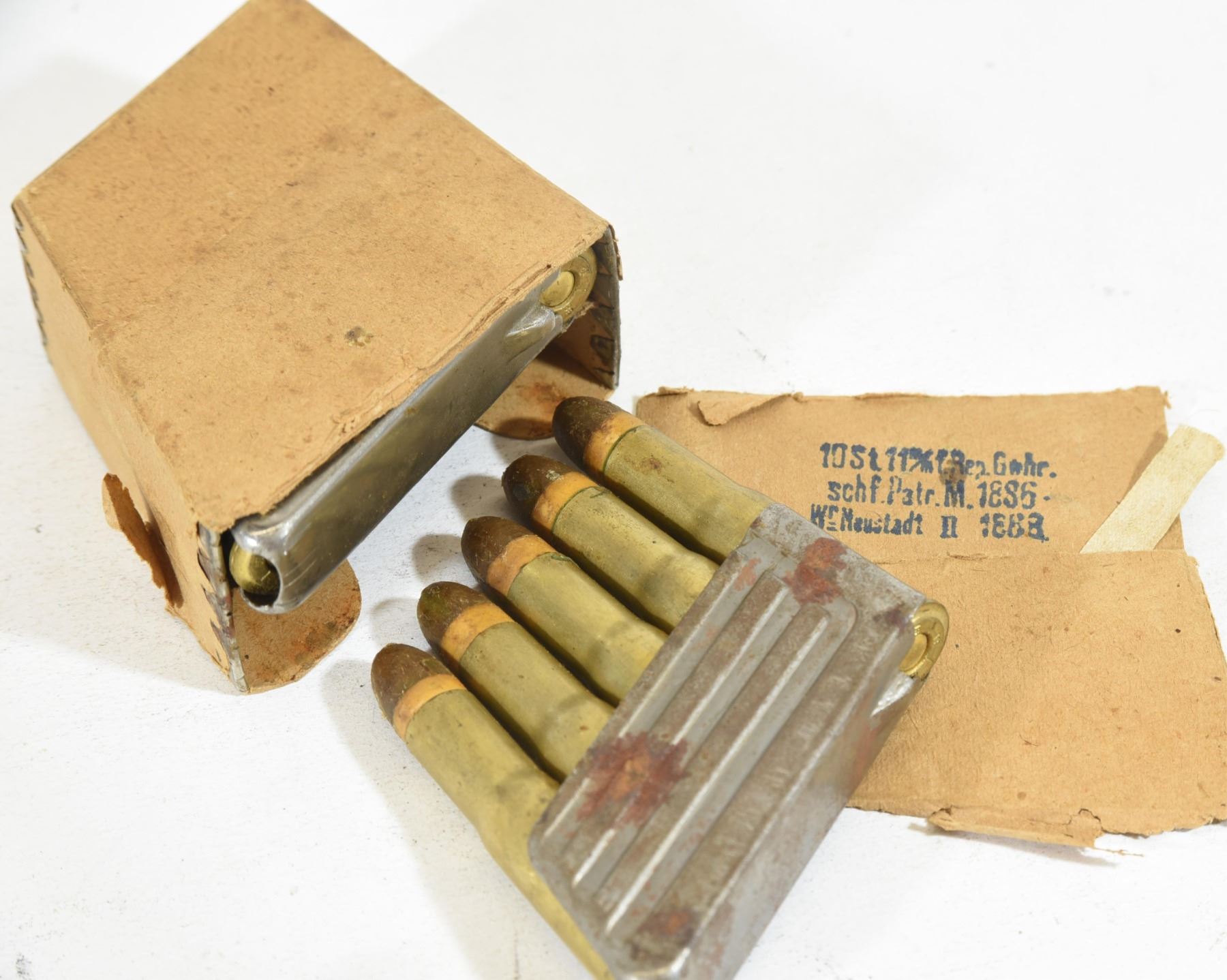 Austrian 11.15x58R Werndl or Mannlicher ammo and 2 stripper clips.