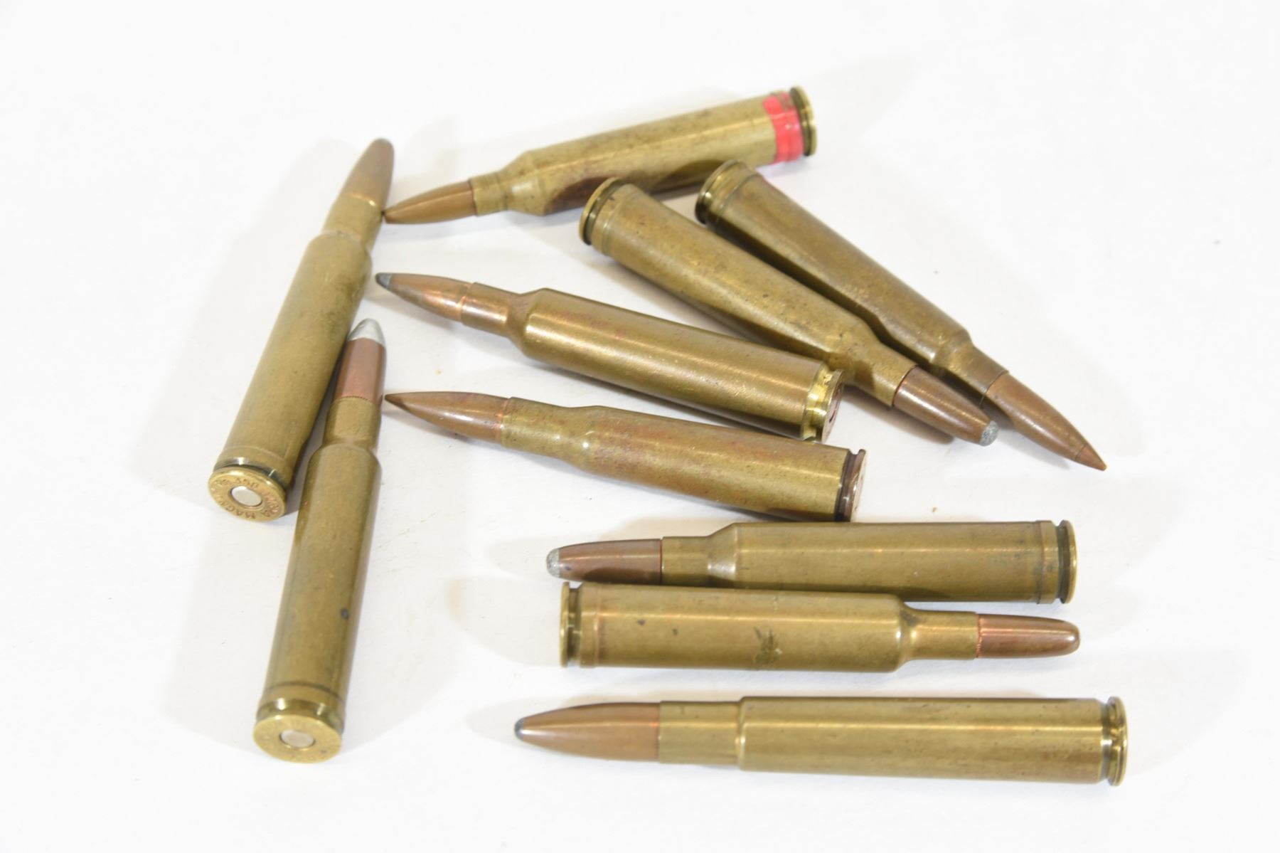 Two rounds 308 Norma mag. One round 358 Norma mag. One round 270 Weatherby mag. One round 350 Nitro Rigby mag. One round 264 Win mag. One round Kynoch 275 mag. One round 303 mag. One round 338 Win mag. One round W.Gehmann 7x66 Super Express.