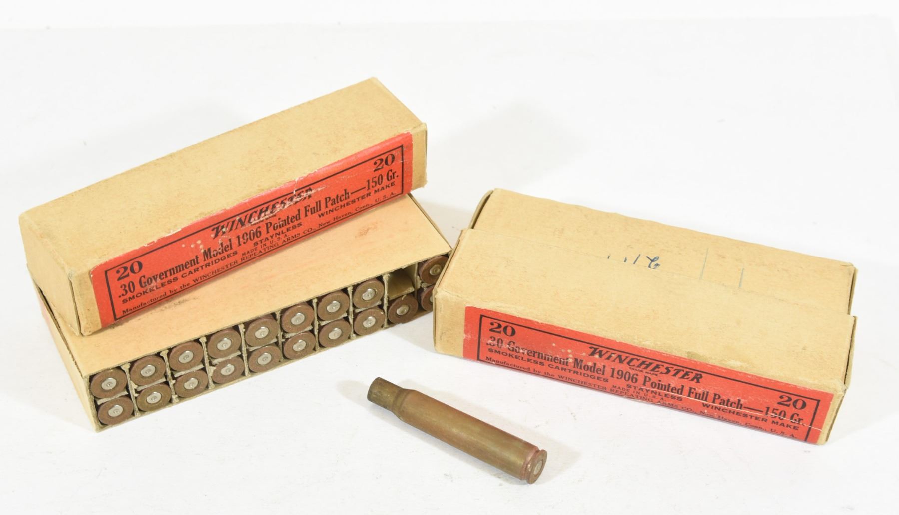 20-piece box of Winchester 30 Gov brass. 18 -iece box of Winchester 30 Gov brass.