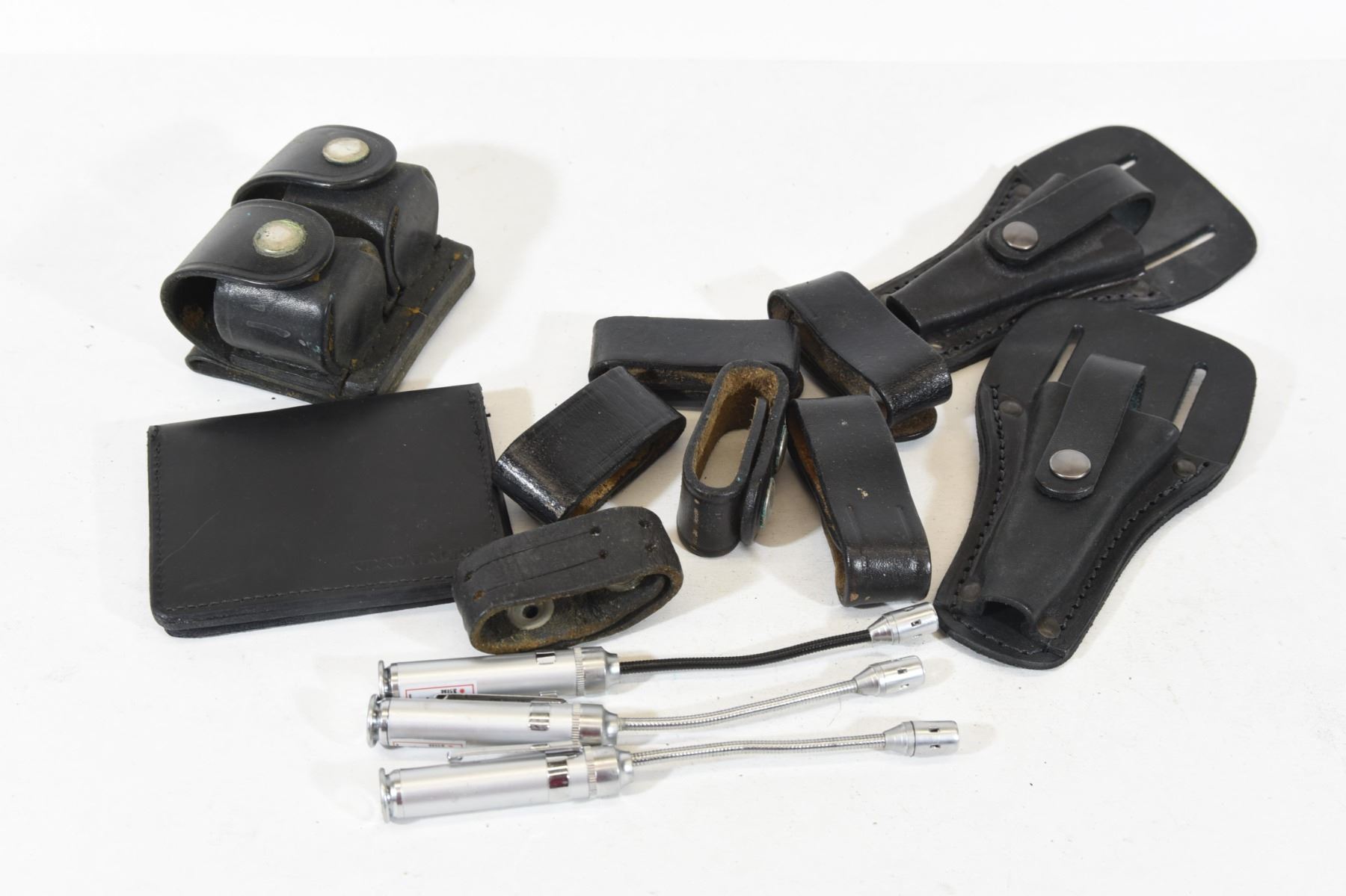 Three bore light/laser light tools. One speed loader leather holster. Two leather pouches. One leather ID wallet. 6 Leather belt straps.