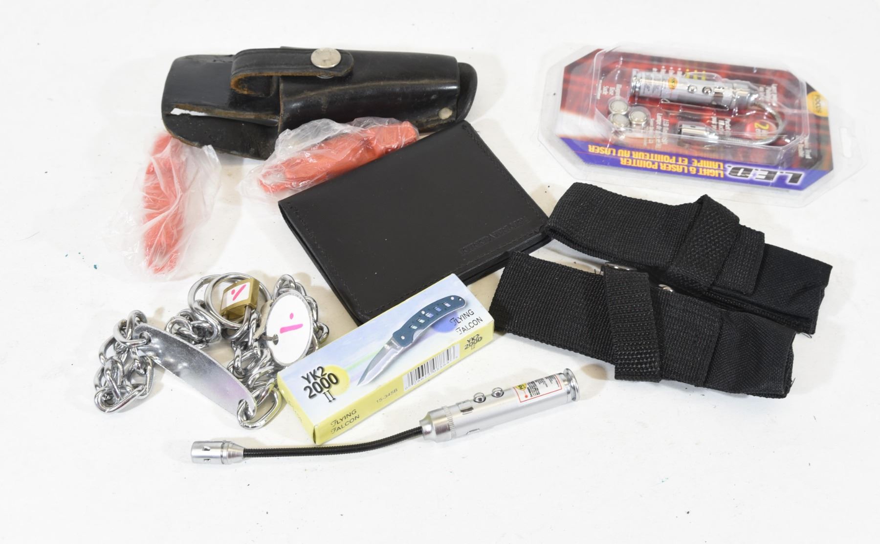21" chain with padlock. YK2 2000 II pocket knife. Two nylon pouches. Two bore light/laser light tools. One leather ID wallet. Two emergency whistles. One leather pouch.
