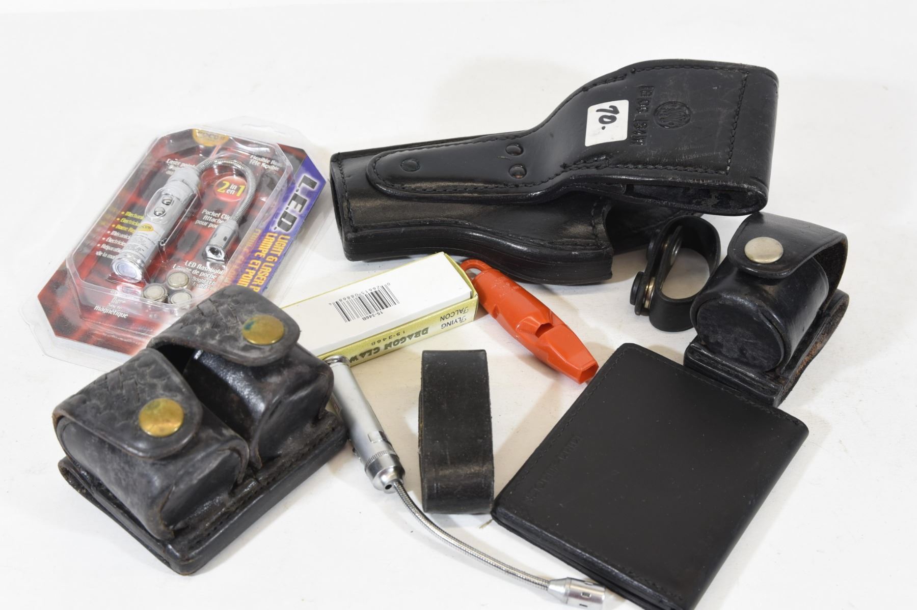Two LED bore/laser lights, leather holster, speed loader mags, whistle, 3" folding knife, leather goods.