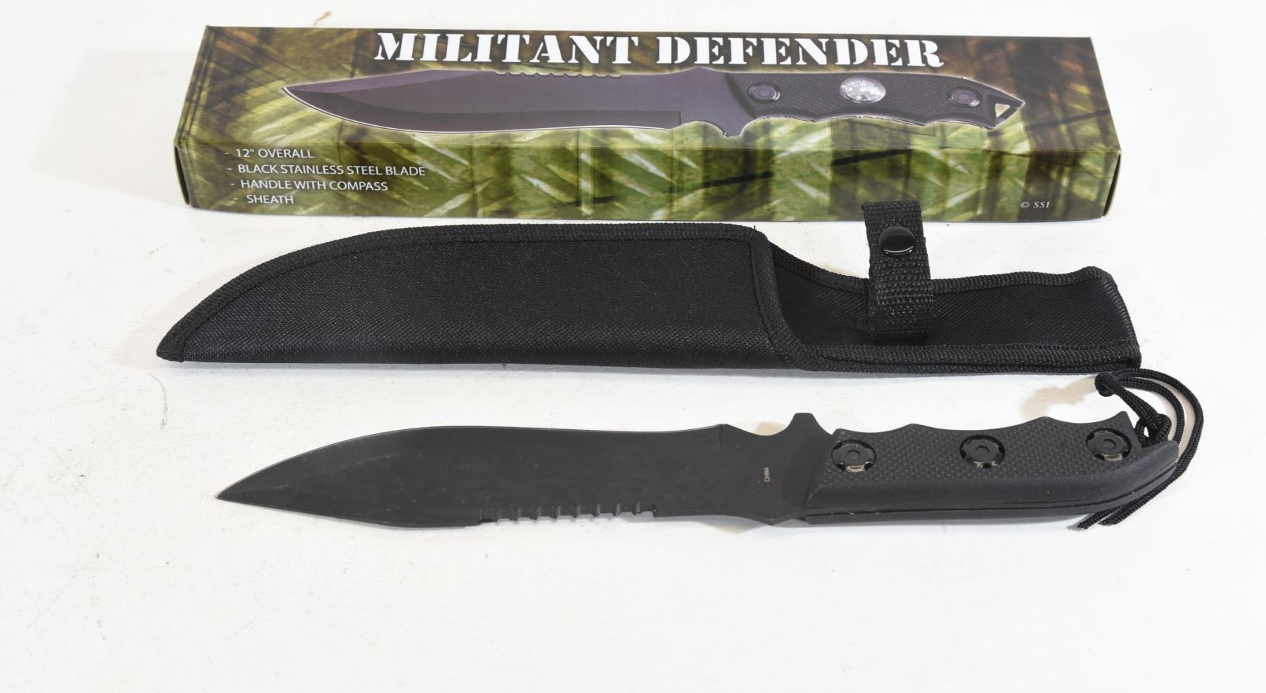 Military Defender black stainless steel knife. Handle has compass. 12" long with 7" blade. Has sheath.