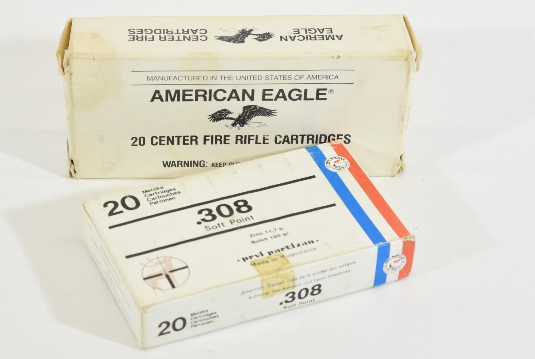 20-round box of Metaka 308Win 180gr soft point. 20-round box of American Eagle 308Win 150gr netal case boat tail.