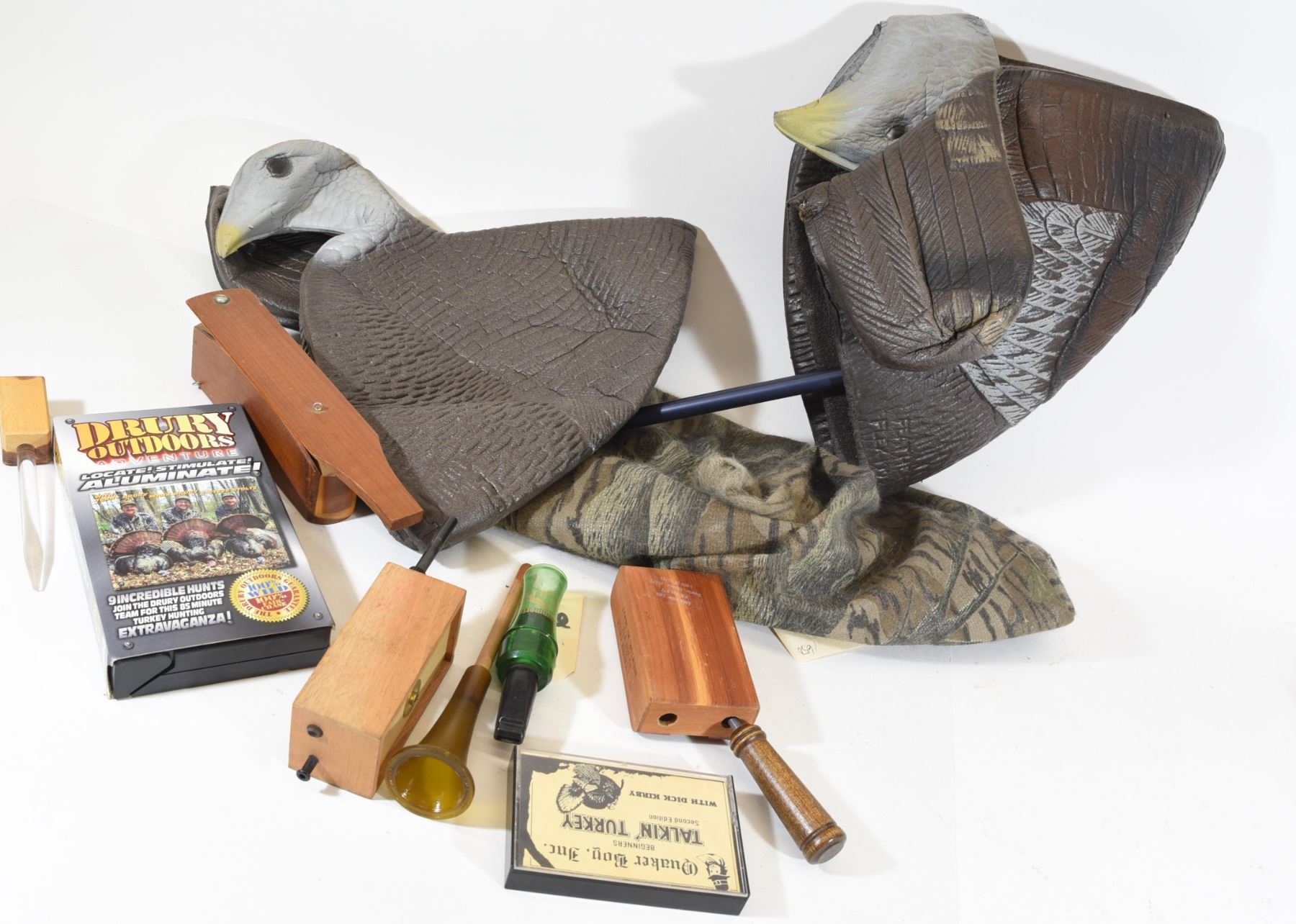 1) 2 foam turkey decoys, only 1 hold down pin. 2) VHS Drury Outdoors. 3) Quaker Boy talking turkey. 4) Assorted turkey calls,