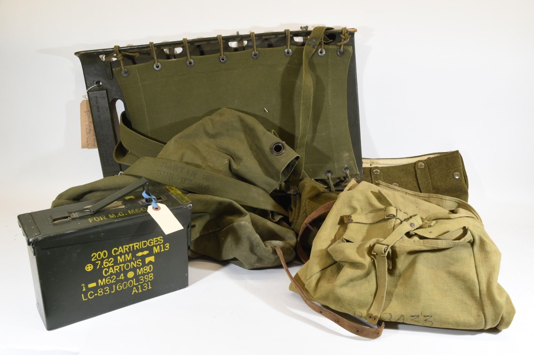 Military ammo box M60-7.62. Military pack frame from 1940. Military duffel bag. Military battle dress 1940 wool pants size 34.
