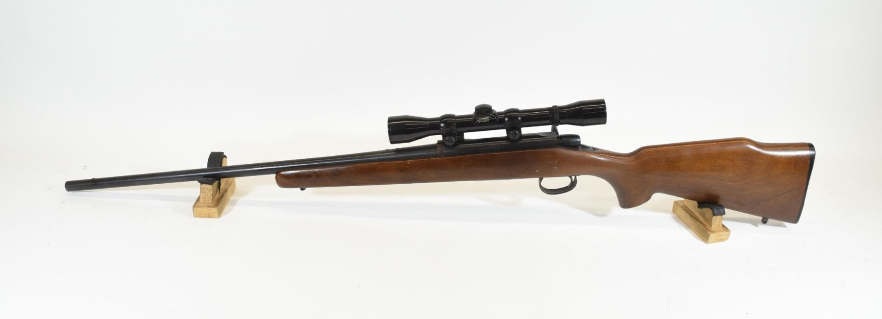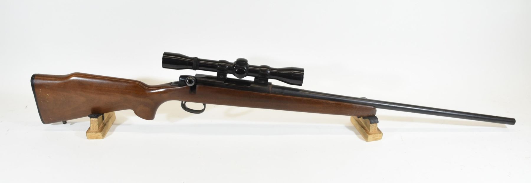 Non-restricted, bolt action, 22-250Rem, 22.5" barrel, SN 6142516. Wood stock has many small dents and scratches, bluing is speckled with rust throughout and has a few minor scratches. Bore is excellent. Rifle has Bushnell 4x Banner scope. No magazine.