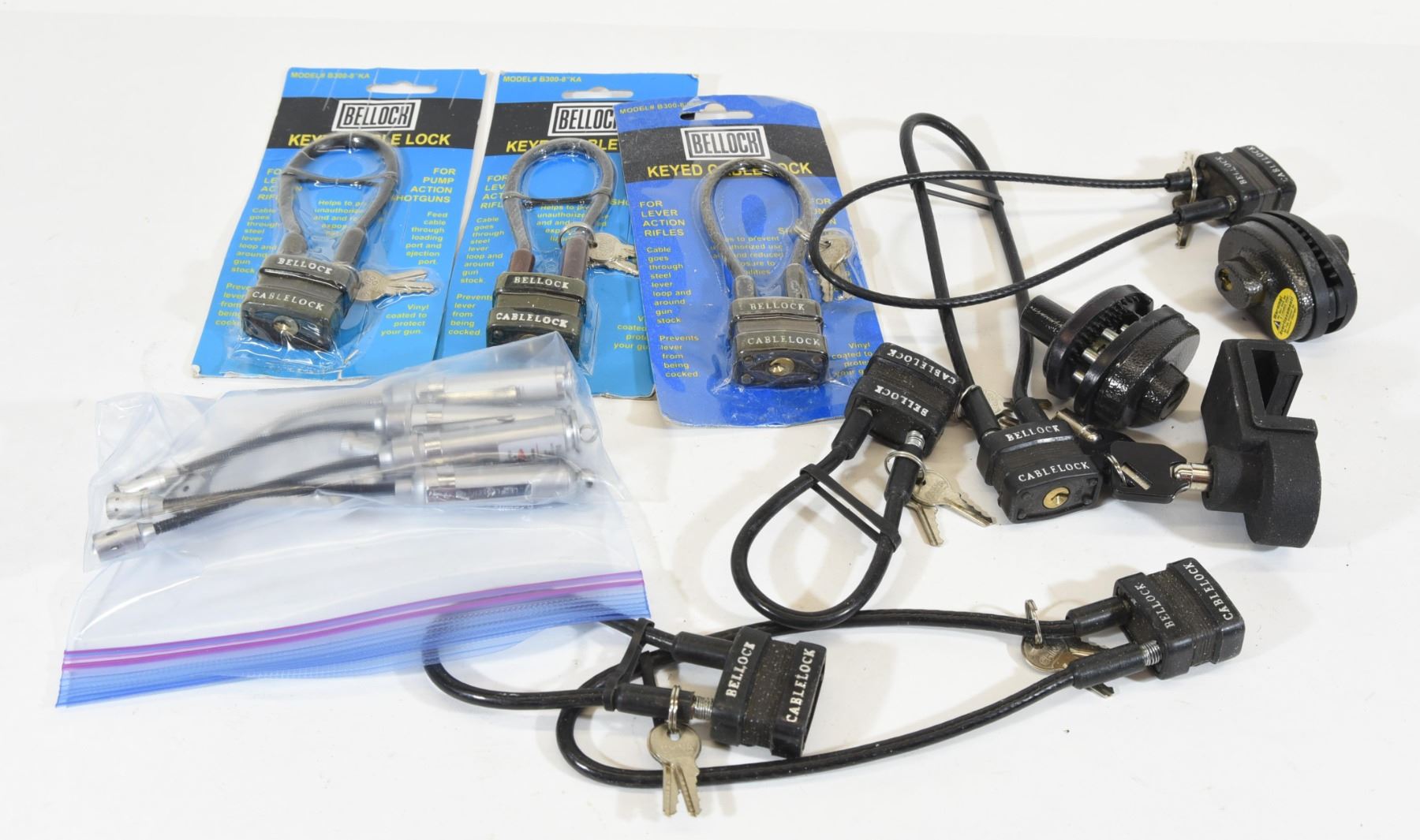 Four bore light/laser lights. Two Master trigger locks. Eight Bellock cable locks with keys. Unknown lock with keys.