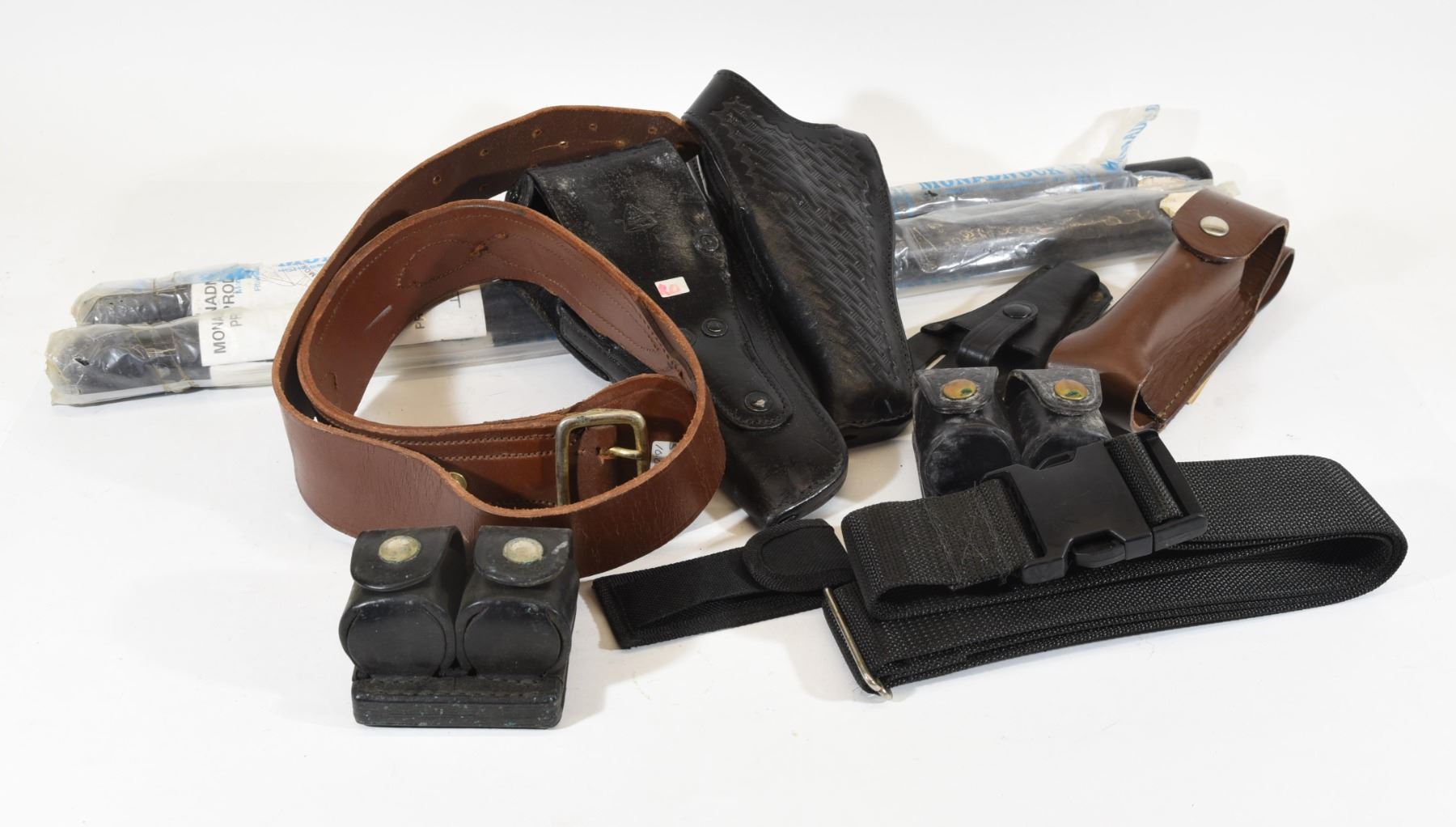 Two 26" billy sticks. Leather shooting belt 43" long x 2" wide. Nylon belt pouch. Nylon shooting belt. Two leather double stack speed loader holsters. Two leather belt pouches. Two unknown leather pistol holsters.