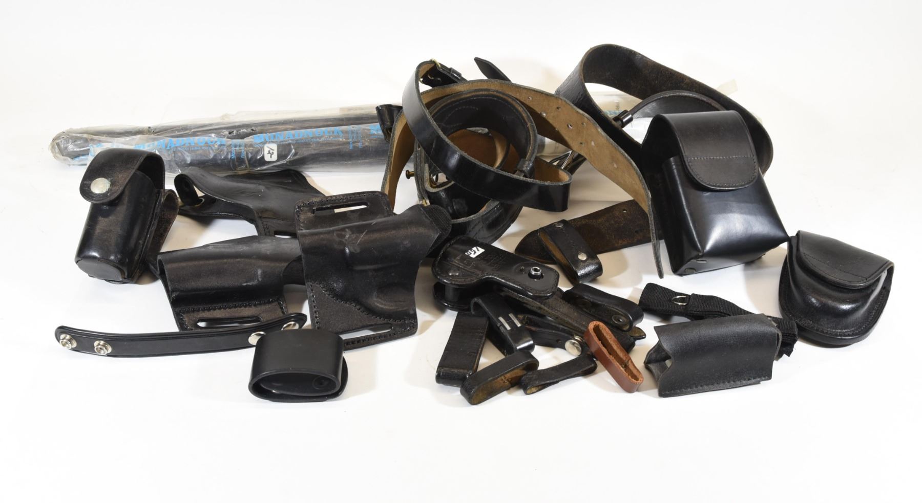 26" billy stick. 29" billy stick. Leather belt loops. Four leather belt pouches. Nylon belt pouch. Four leather pistol holsters. Leather shooting belt 39" long x 2" wide. One speed loader (unknown cal). Leather shooting belt 46" long x 2" wide.