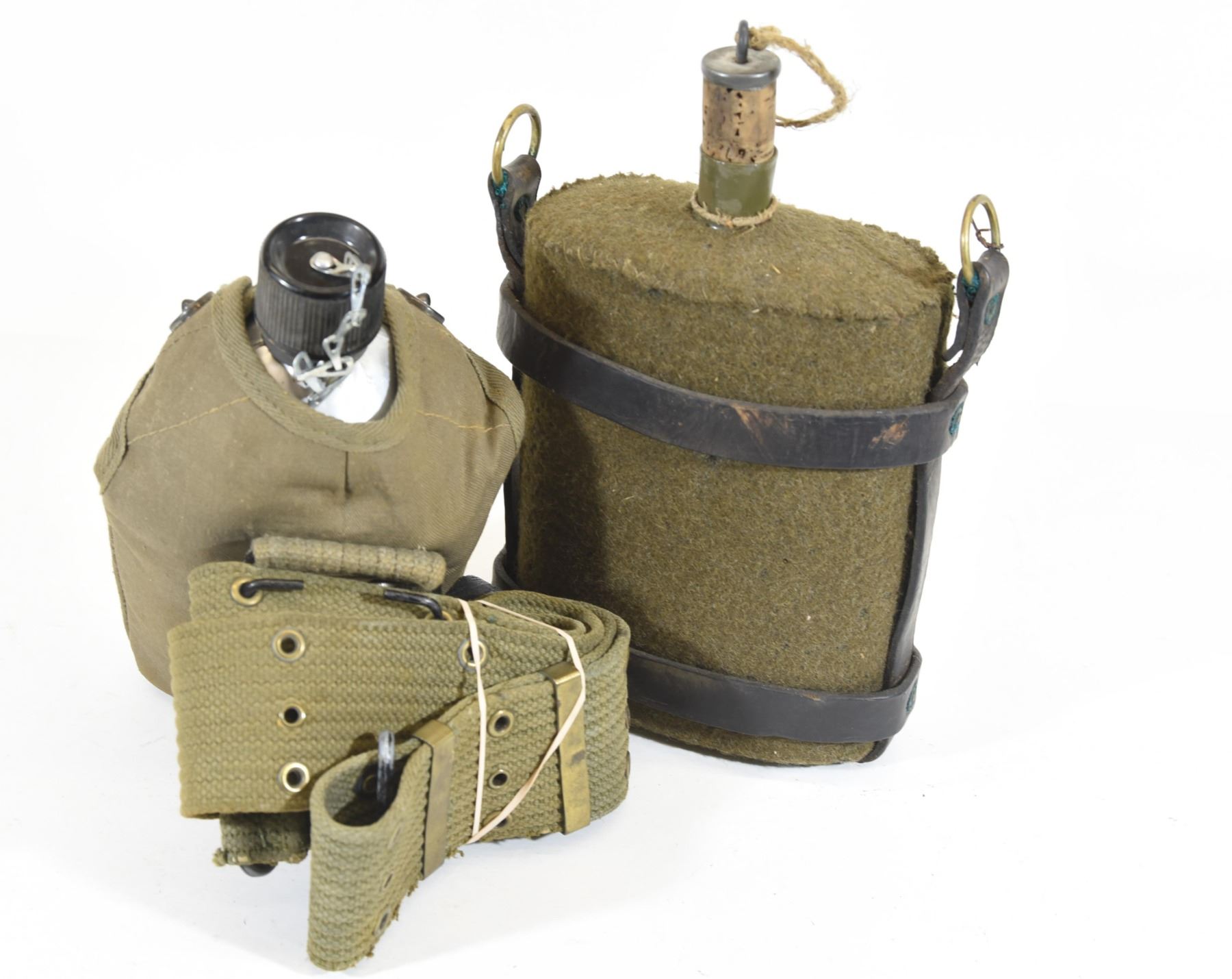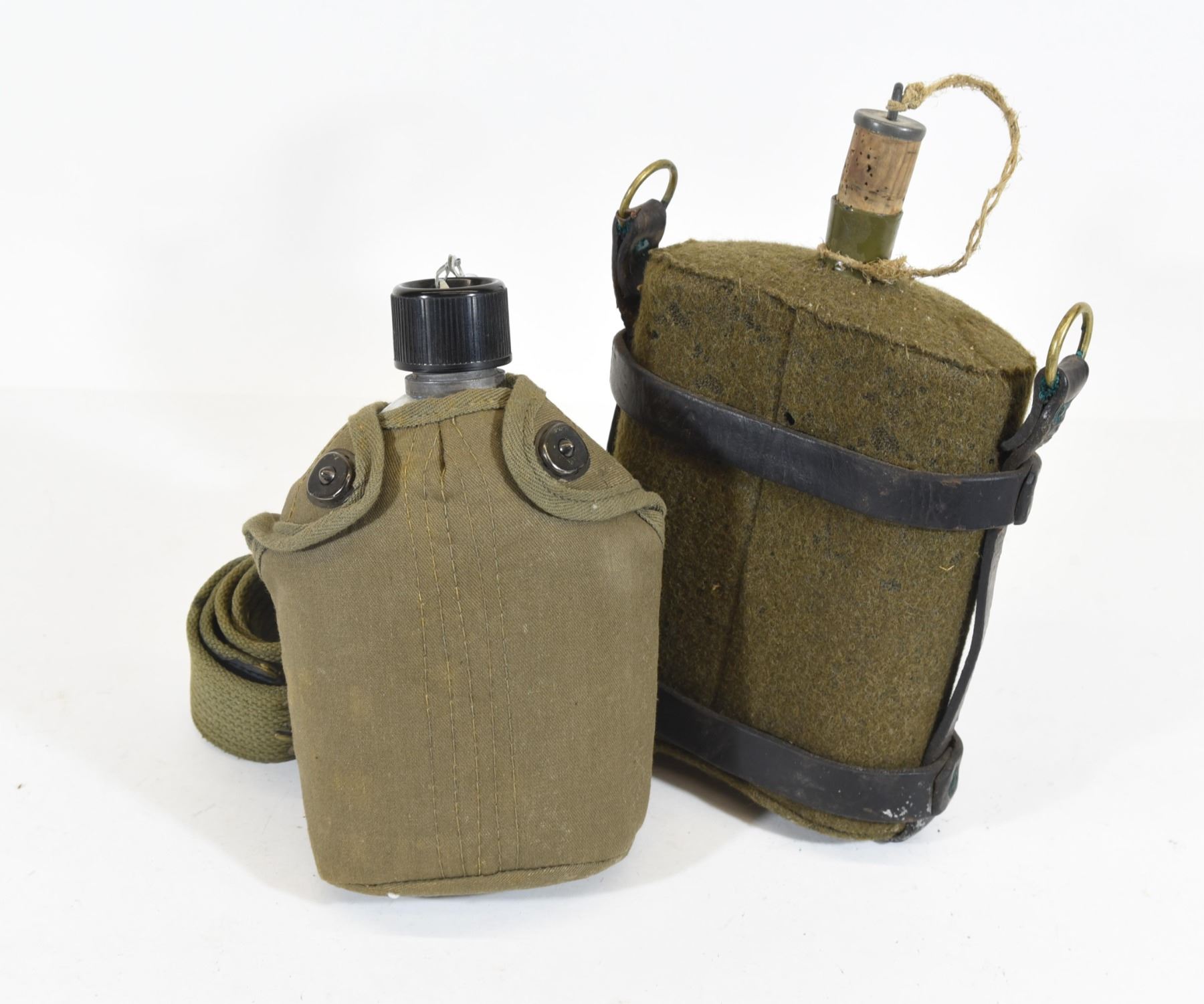 1) Reproduction tin US pattern canteen. 2) British canteen with M-1903 leather carrier.