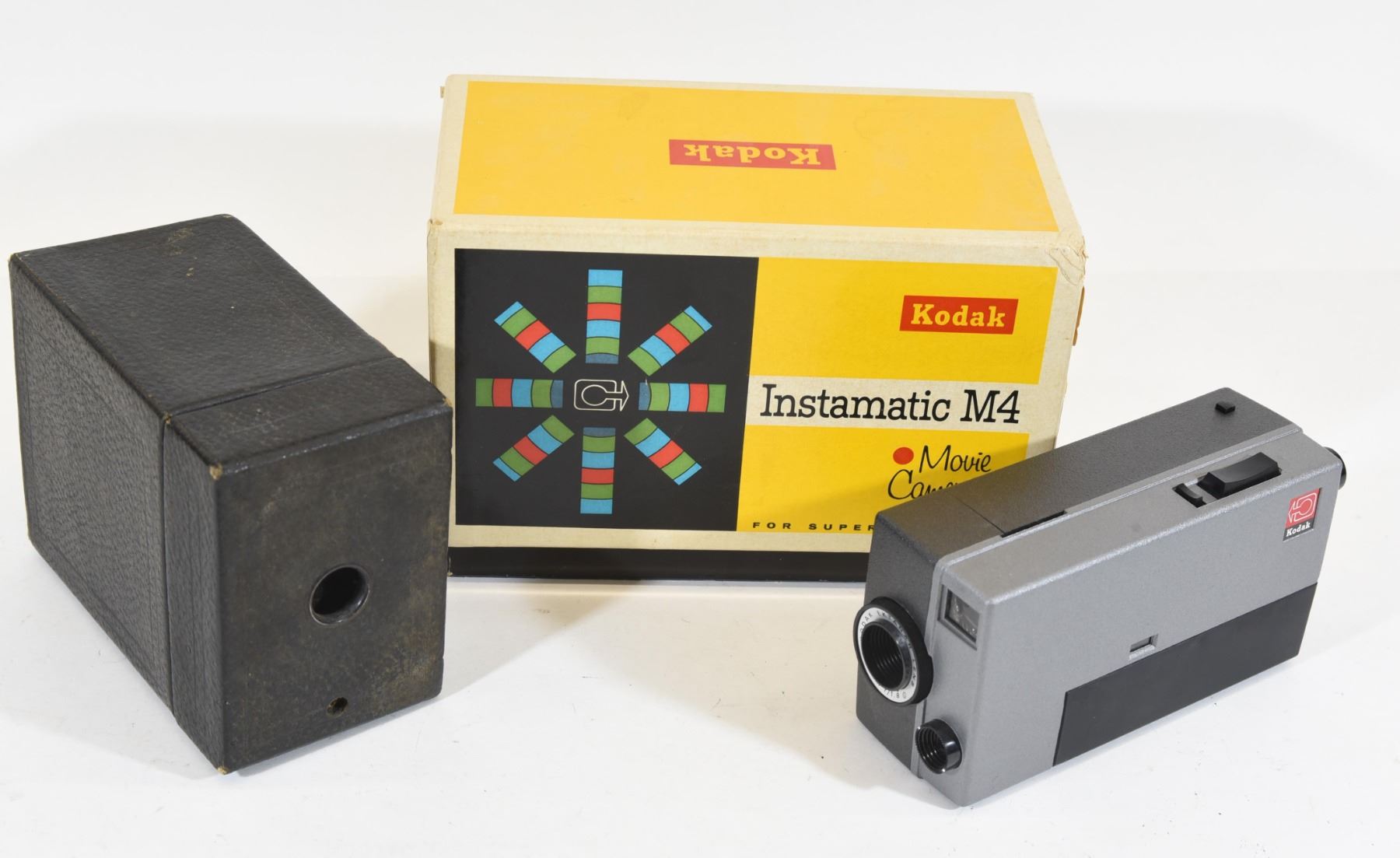 Kodak Instamatic M4 Super 8 movie camera with original box. Box camera that uses Kodak No. 120 film.
