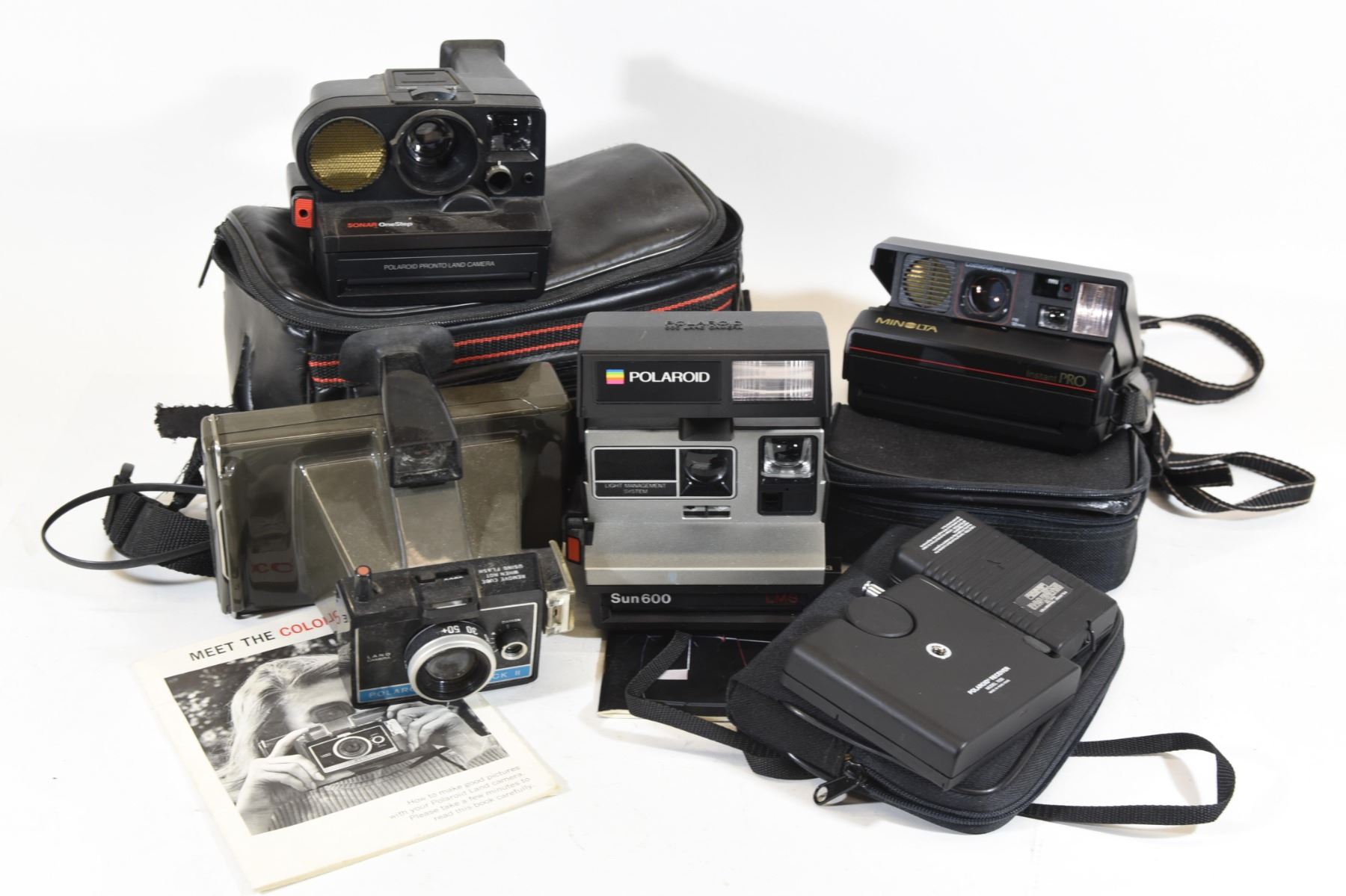 Polaroid Colorpack II, Polaroid Pronto Land Camera, Minolta Instant Pro with macro lens, Polaroid Transmitter & Receiver, Polaroid Sun600 and carry bag.