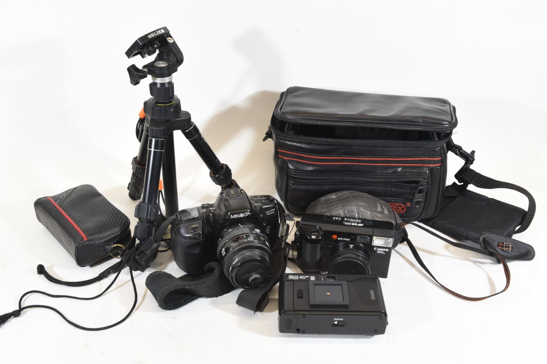 Minolta Maxxum 400si, Slik 450G tripod, Yashica TAF, Canon ML with carry case.