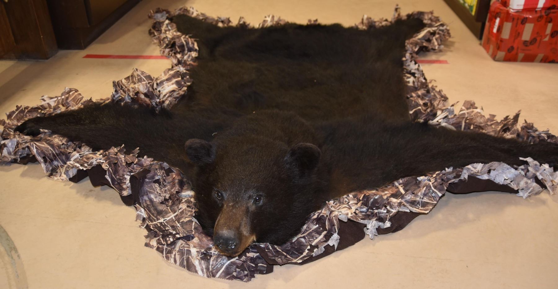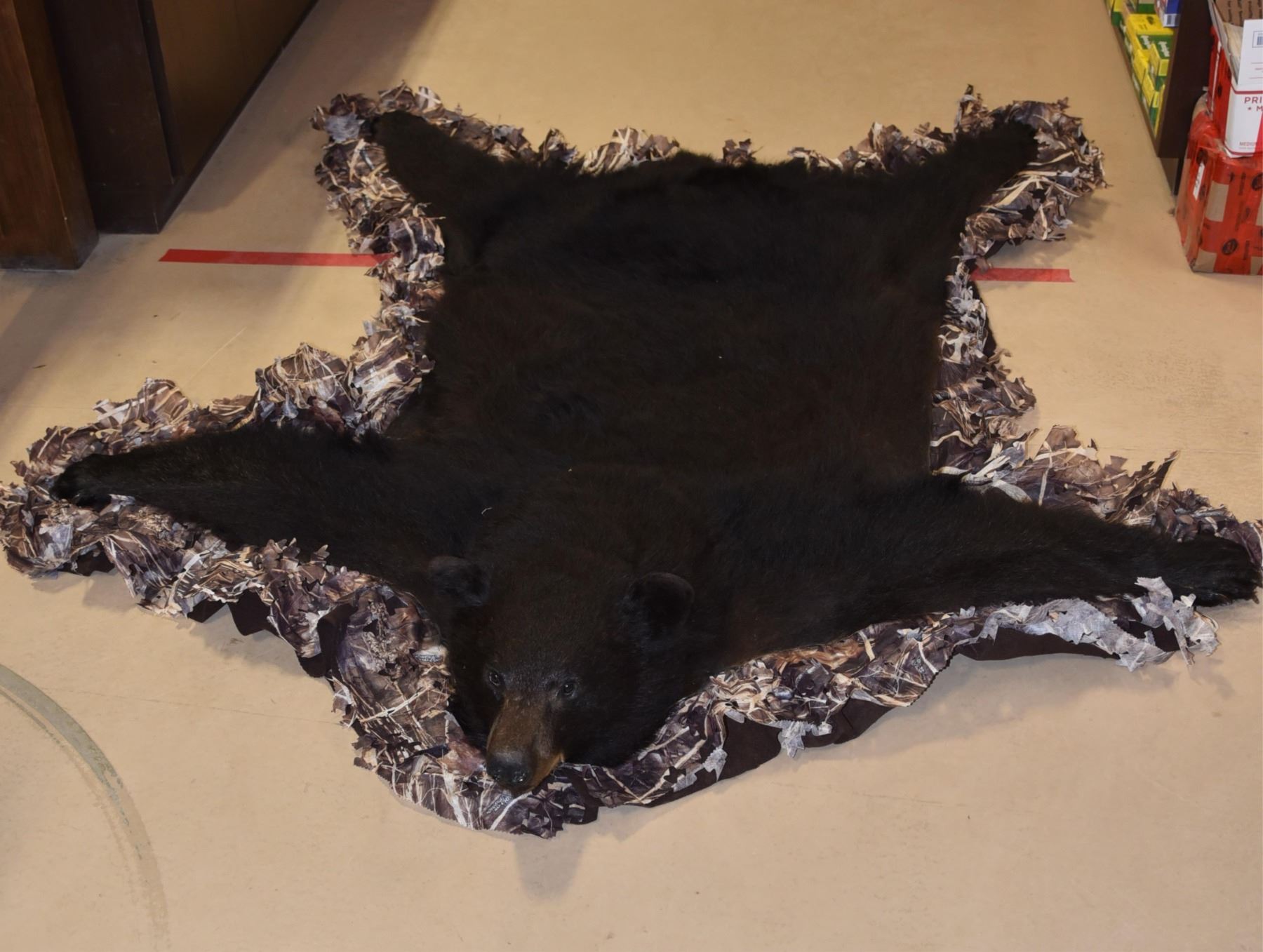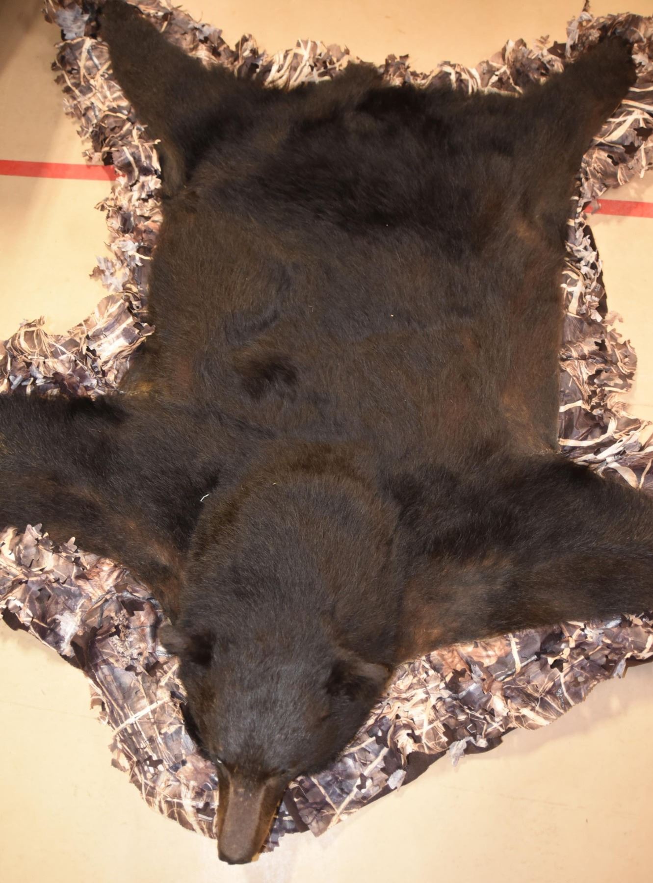 This rug has a raised head with a closed mouth. Brown fabric and felt liner on back side. Length 65". Width (front feet): 65". Extra Charges Will Apply For Packaging and Shipping. Pick up is recommended.