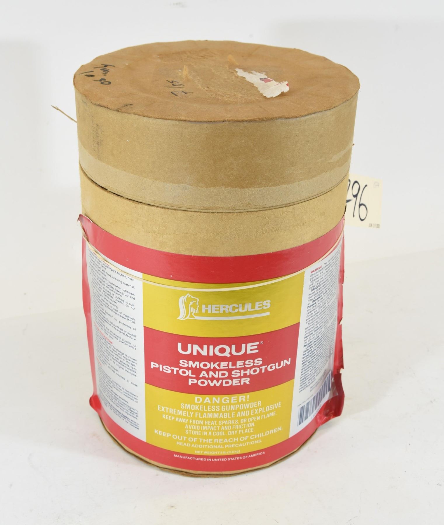 Hercules Unique smokeless propellant. Cardboard can has 7lbs written on it and weighs 7lbs including the container.