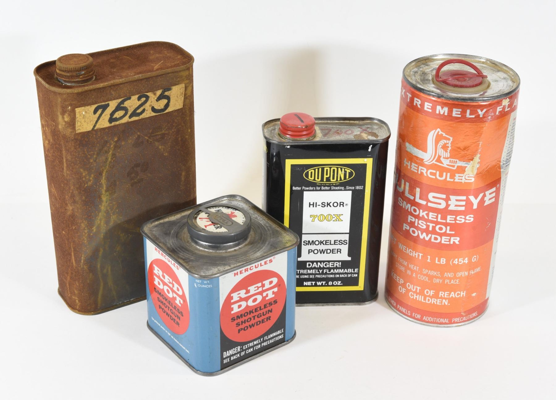 1) Bullseye. 2) Red Dot. 3) 700X. 4) 7625. All cans are empty