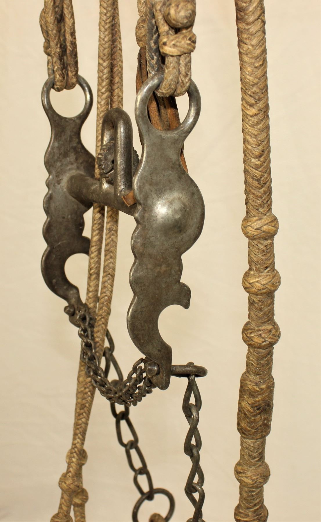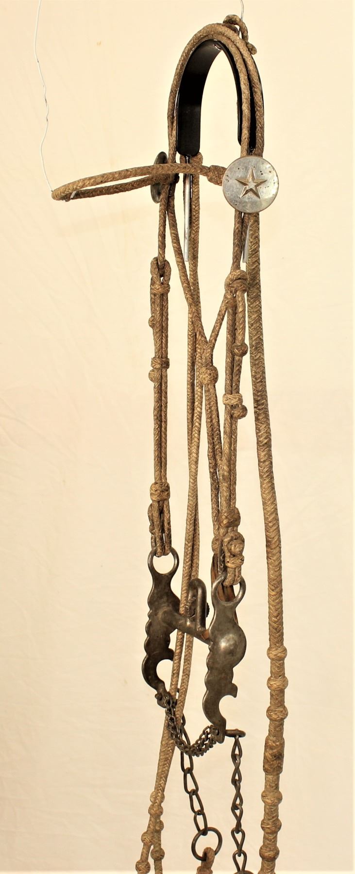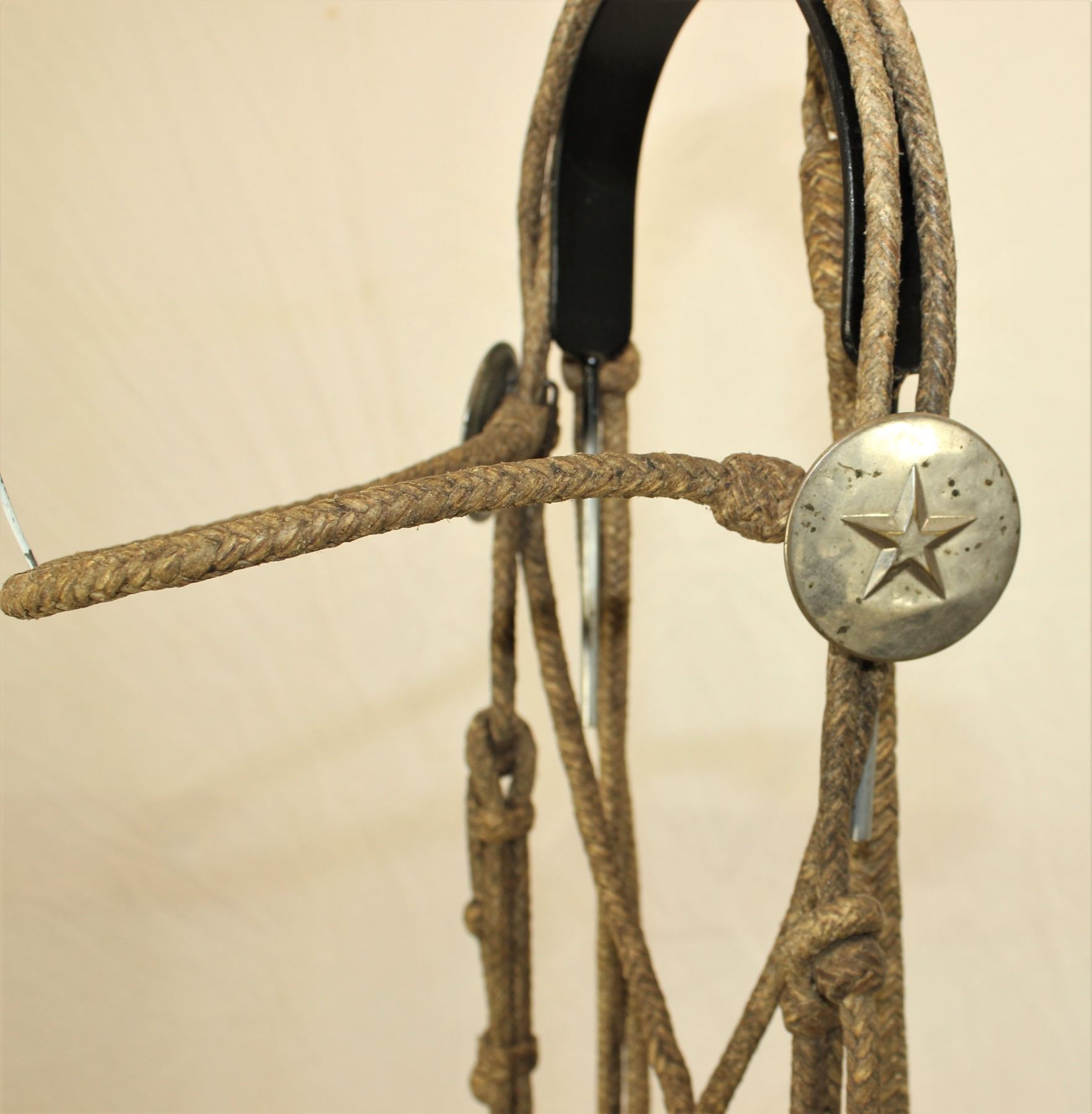 Very nice braided rawhide bridle with nickel rosettes, wonderful romel reins, and a mint condition North & Judd dove bit.