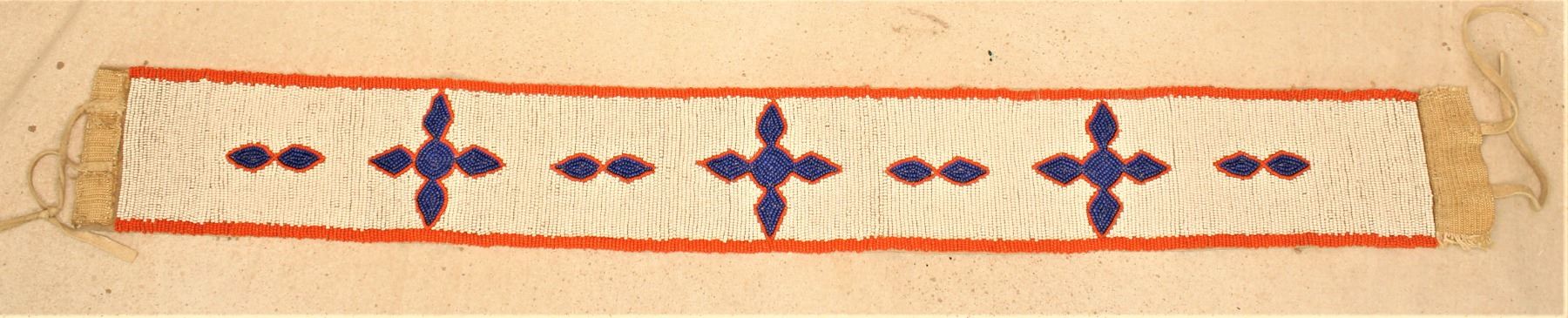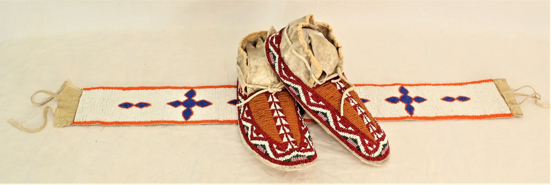 Grouping of 1920's Plains Indian moccasins with buffalo track design using pumkin and red beads, accompanied by a 3" wide girls beaded belt.