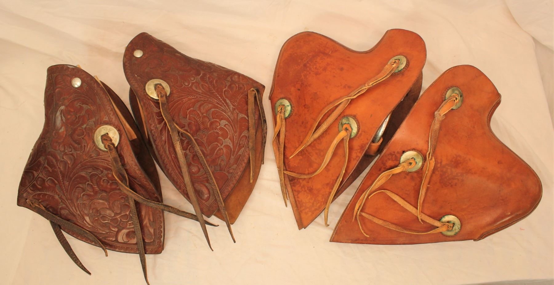 Two pairs of terrific tapaderos, one large light colored pair in near mint condition with great Mueller maker marks, and the other unmarked pair with fantastic flower tooling.