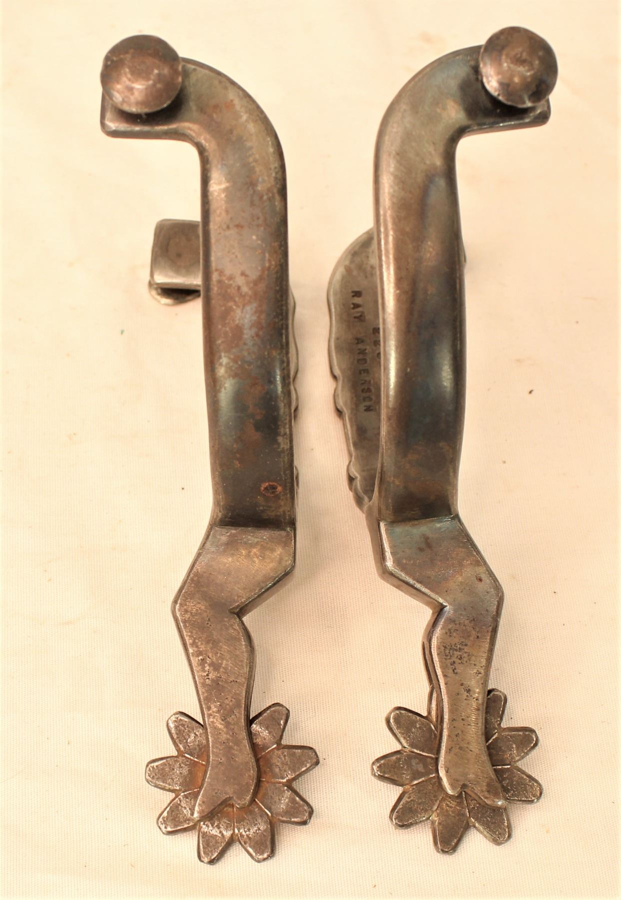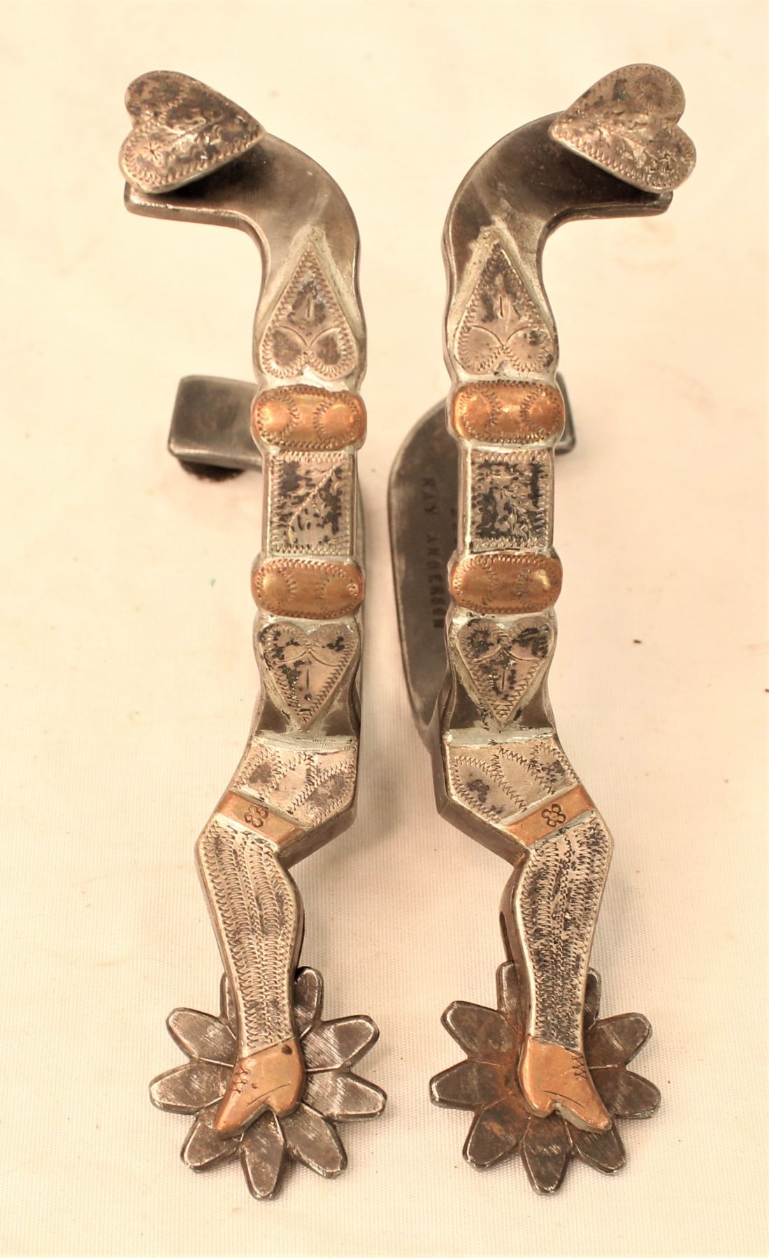 Wonderful pair of single mounted two-tone lady leg spurs with double peanut heelbands and heart buttons. Well marked inside the heelband.