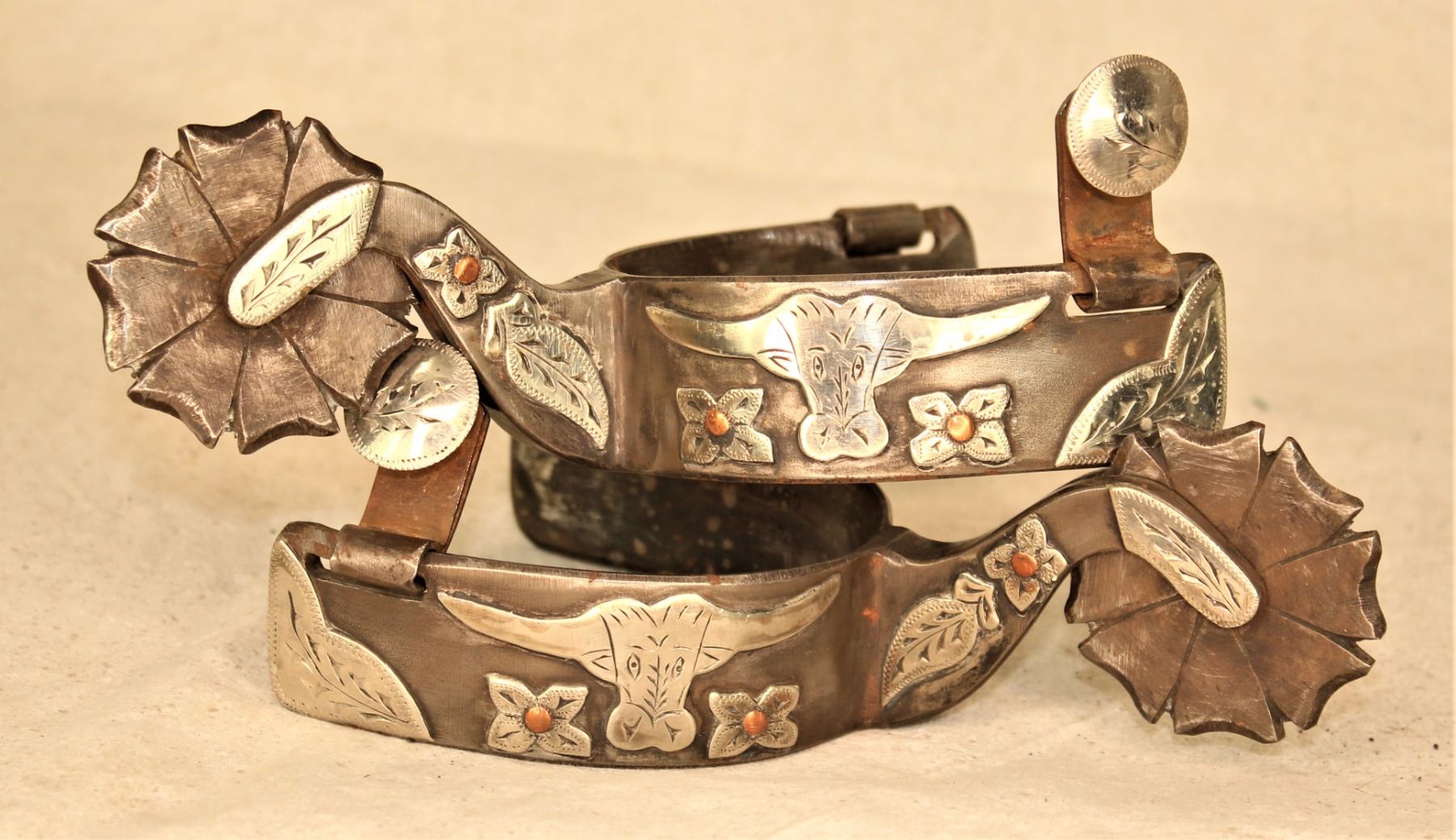 Classic large pair of Pollards, double mounted with steerheads and two tone flowers, completed with huge web rowels.