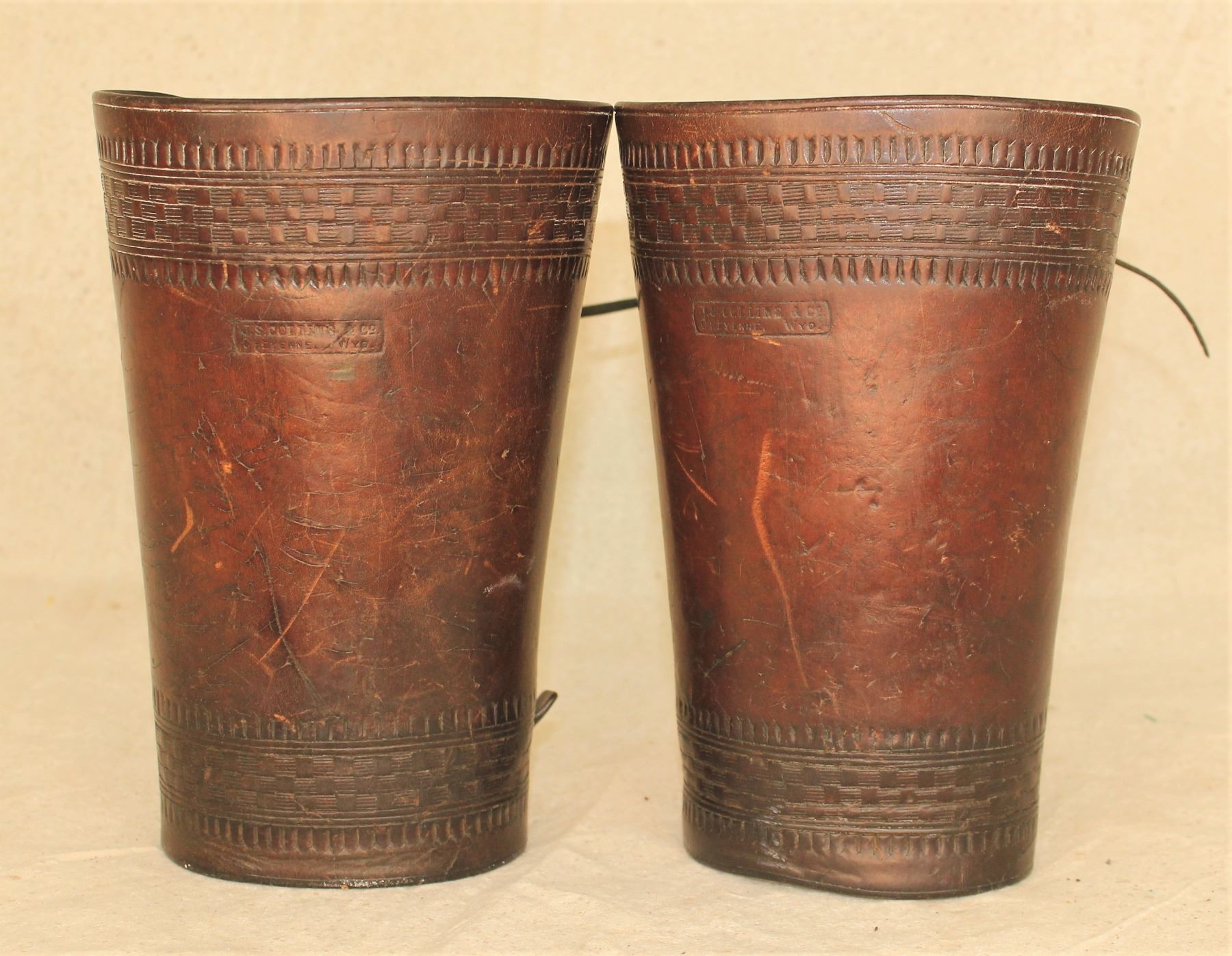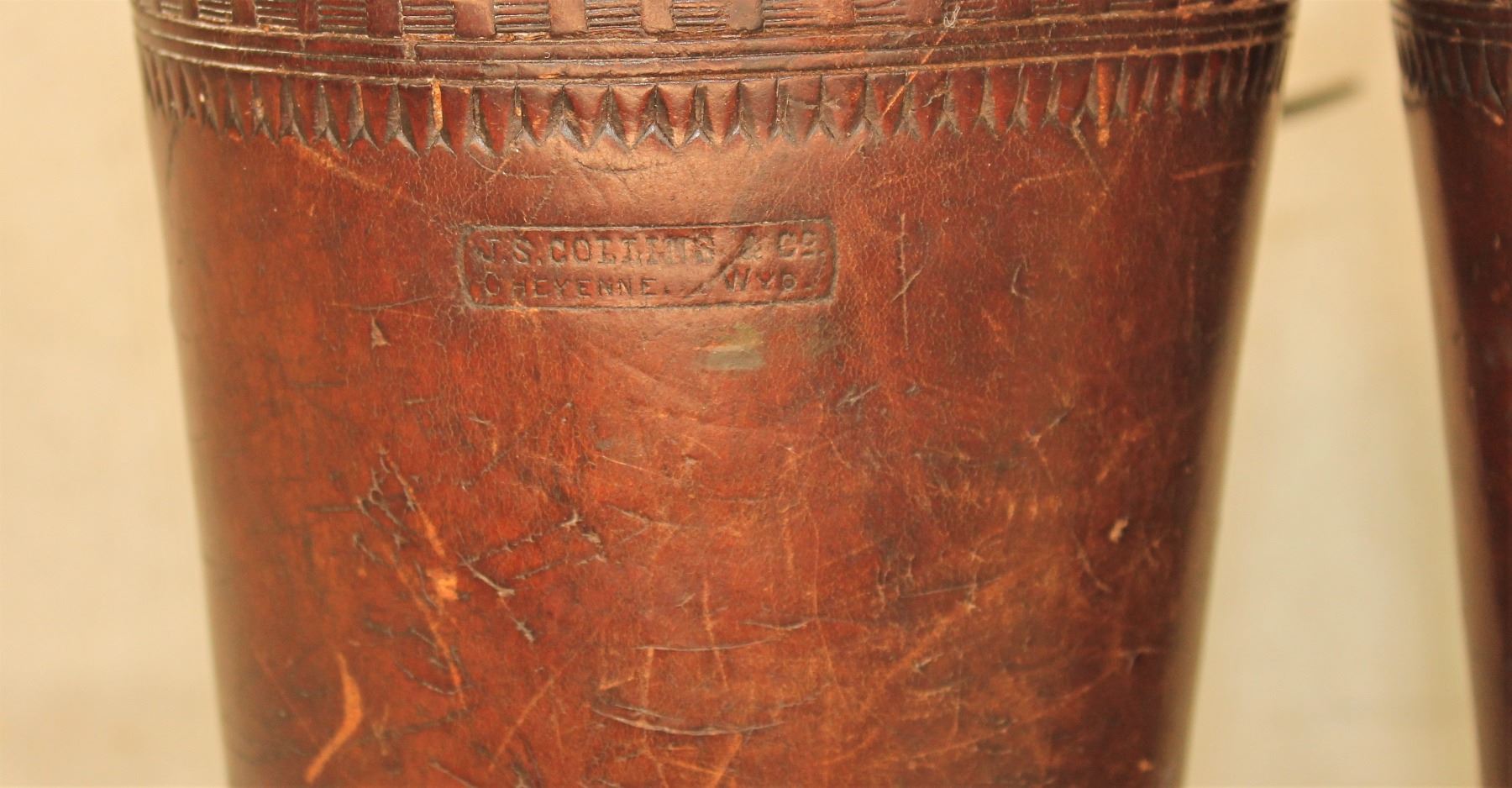 Fascinating rare find, large Cheyenne, WY made cuffs with great color, unique tooling pattern, and maker's marks. Roger Wilmot Collection