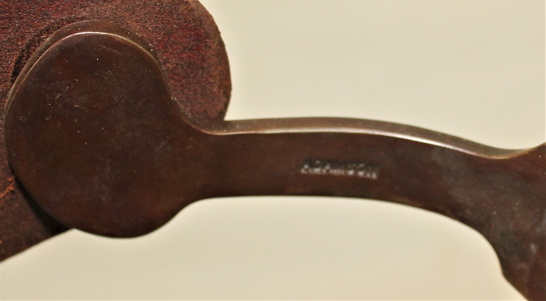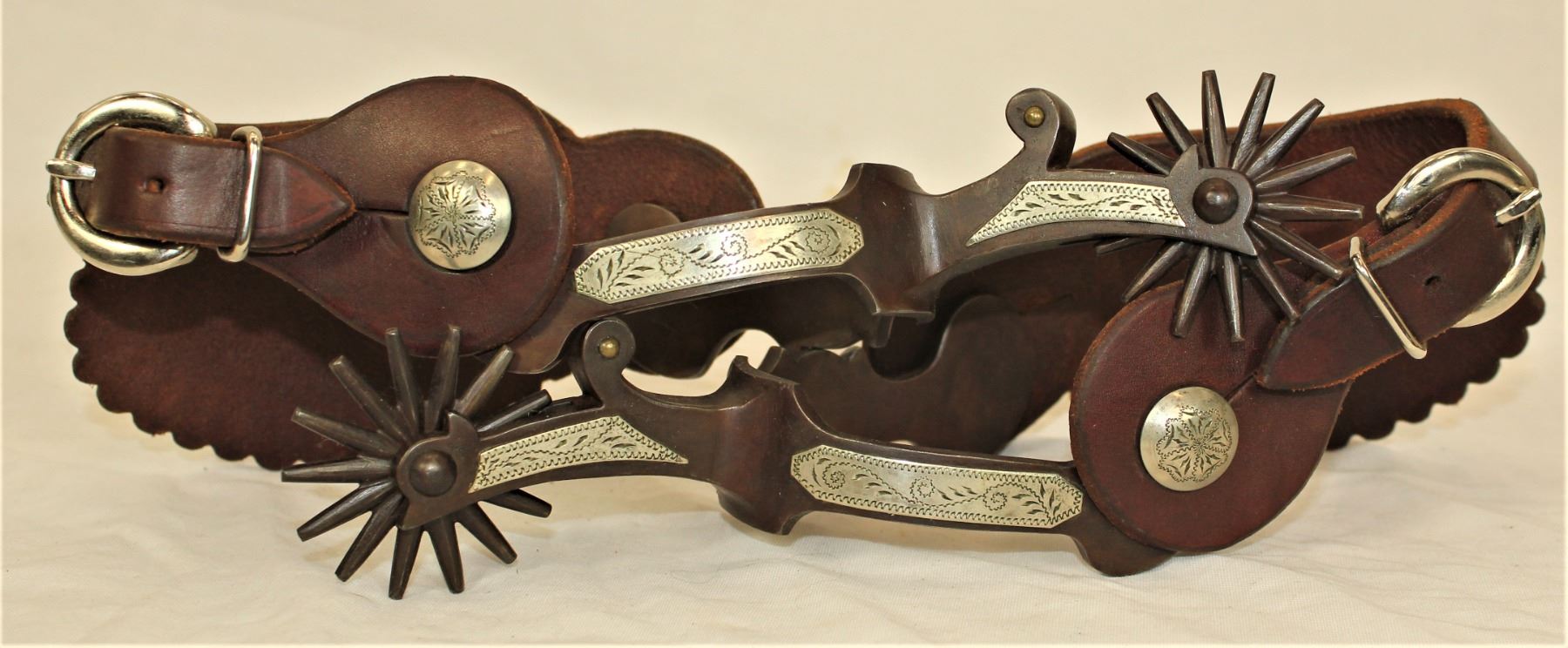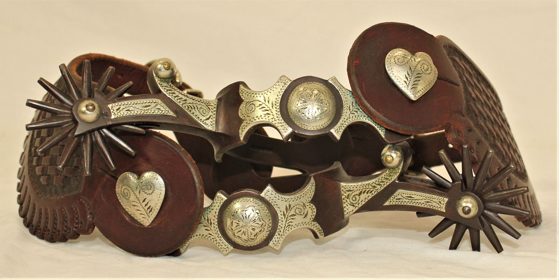 Great pair of oversized double mounted spurs with scalloped heelbands, exagerated chapgaurds and large heart buttons. Nicely marked inside the heelband.