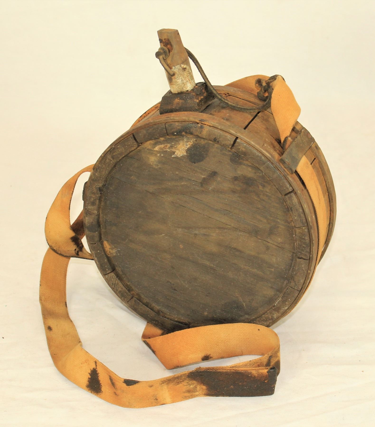 Seldom seen Civil War period wooden canteen with metal binding, stopper and original canvas strap.