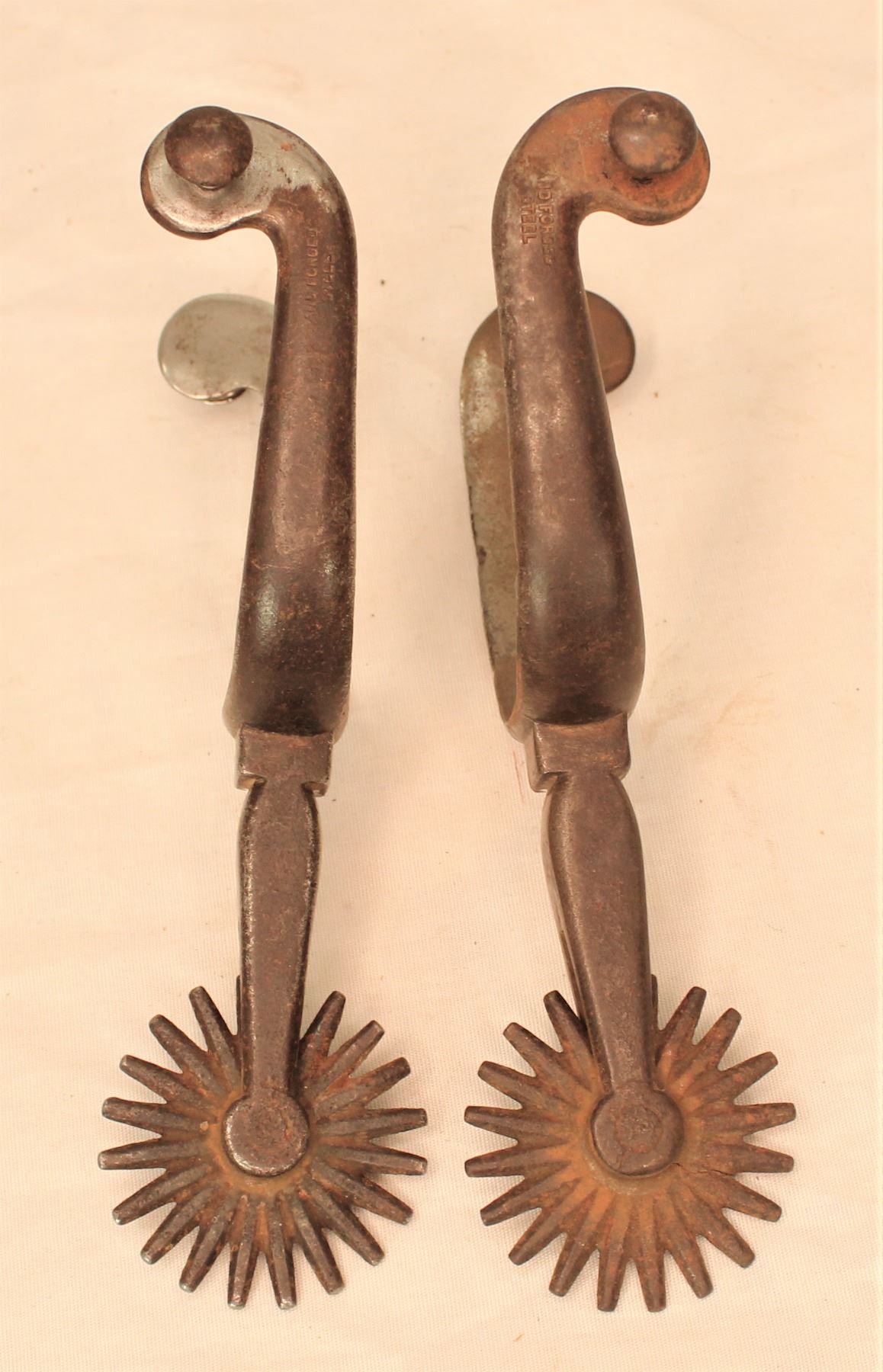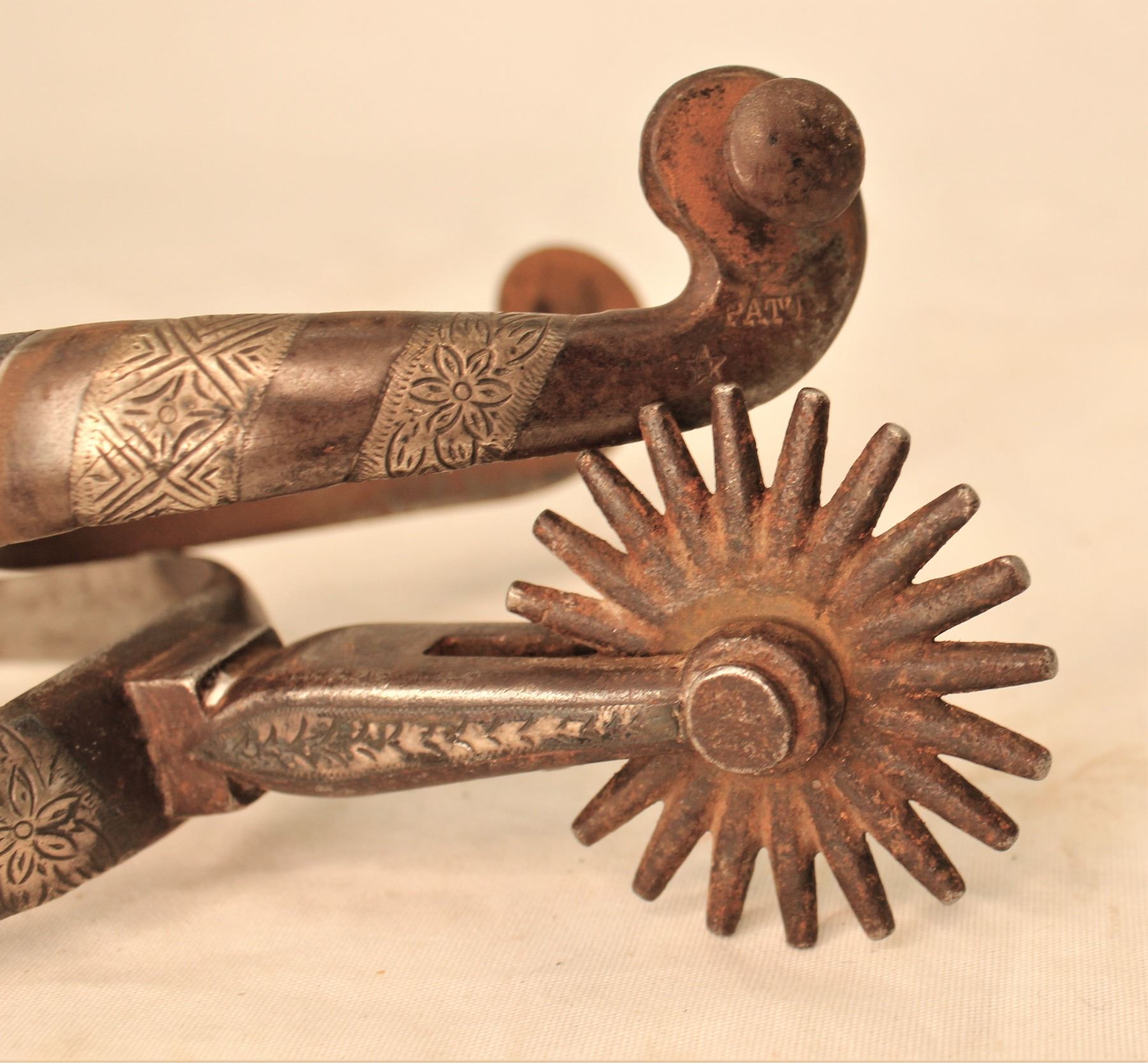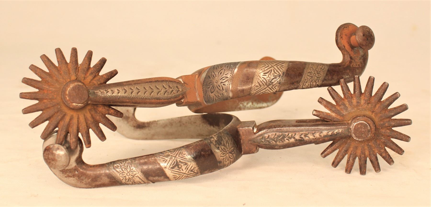 Stylish pair of single inlaid California style spurs with long straight shanks, and terrific maker's marks.