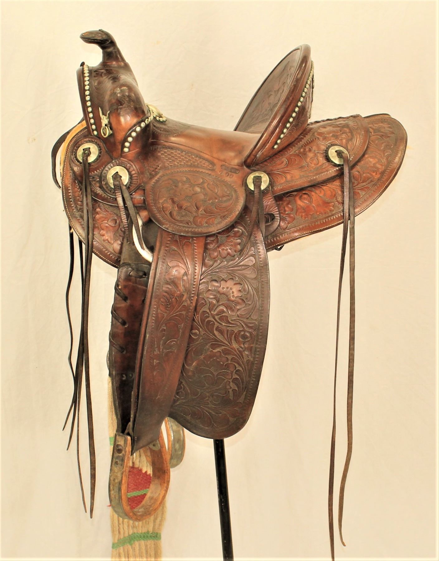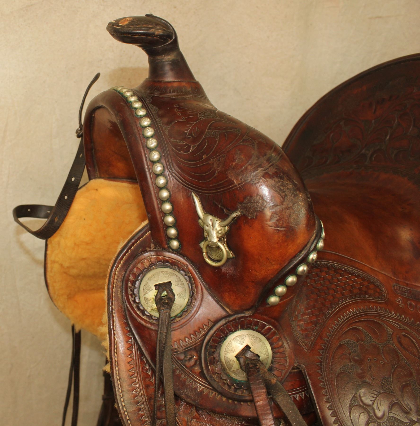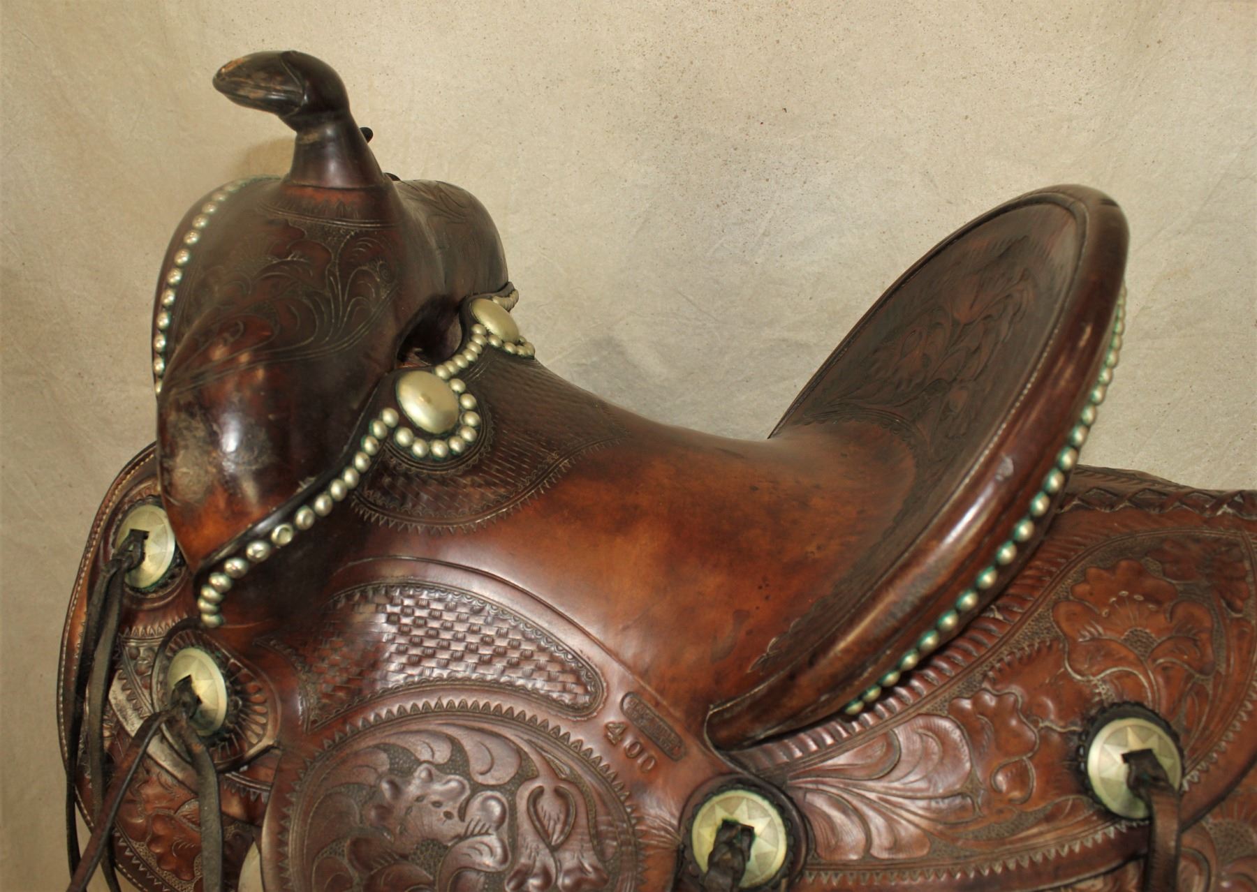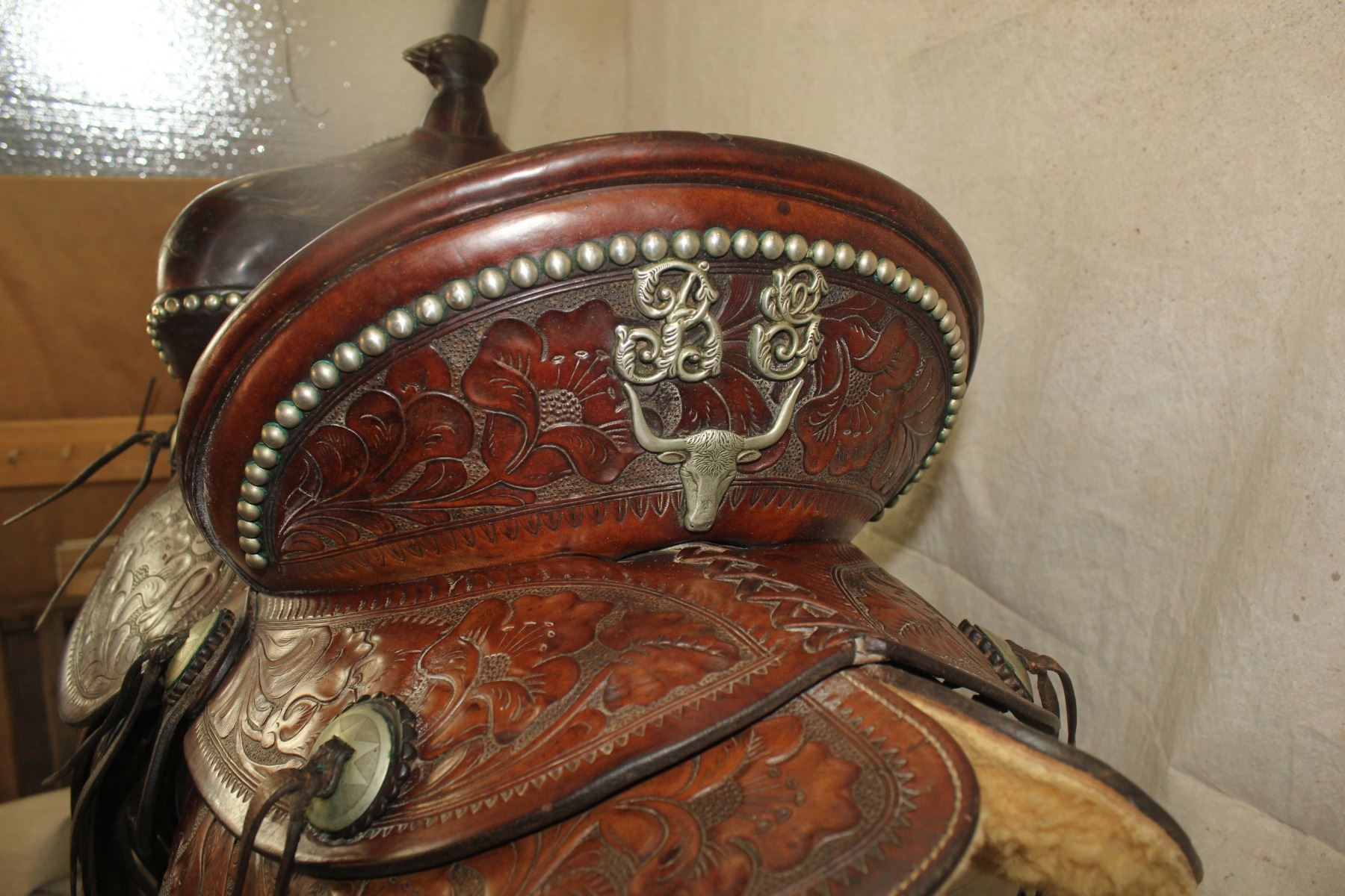 Outstanding Cheyenne made saddle that boasts tall cantle and frontend, molded silver steerheads, decorative nickel studs and conchos and incredible flower tooling. Roger Wilmot Collection