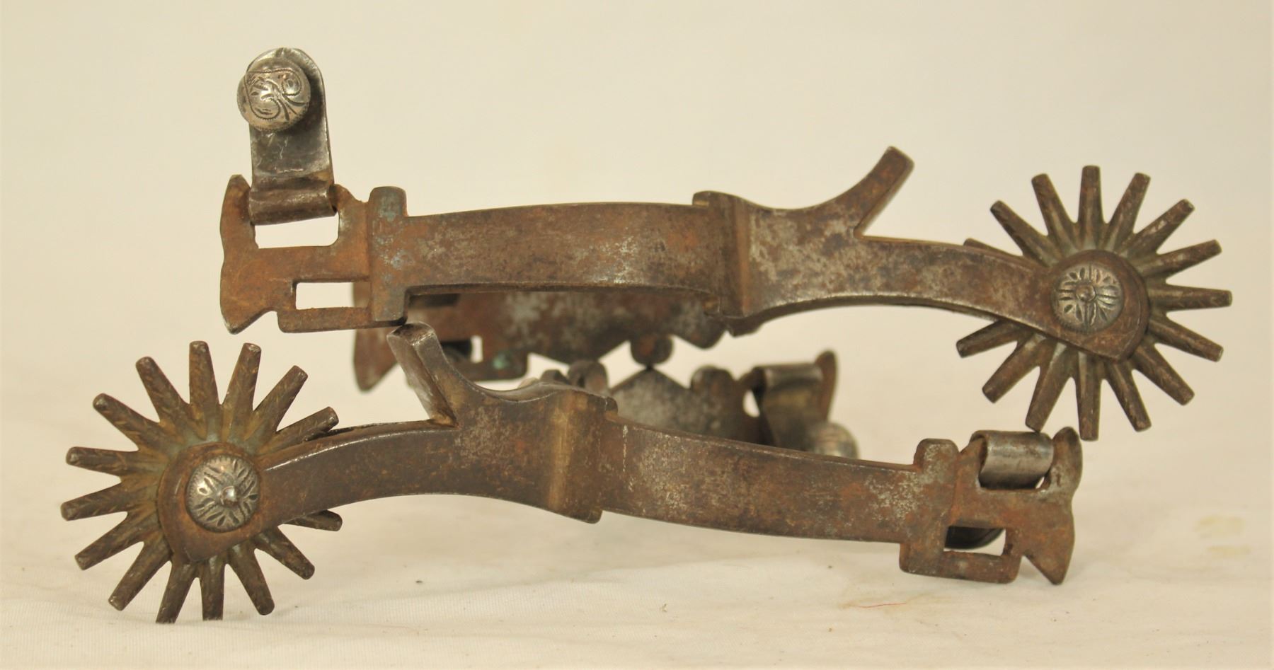 Very unique pair of single mounted spurs with full silver overlay, scalloped heelbands, multiple domes and deep stylish engraving, with swinging buttons and wonderful lagre rowels with feathered tips.