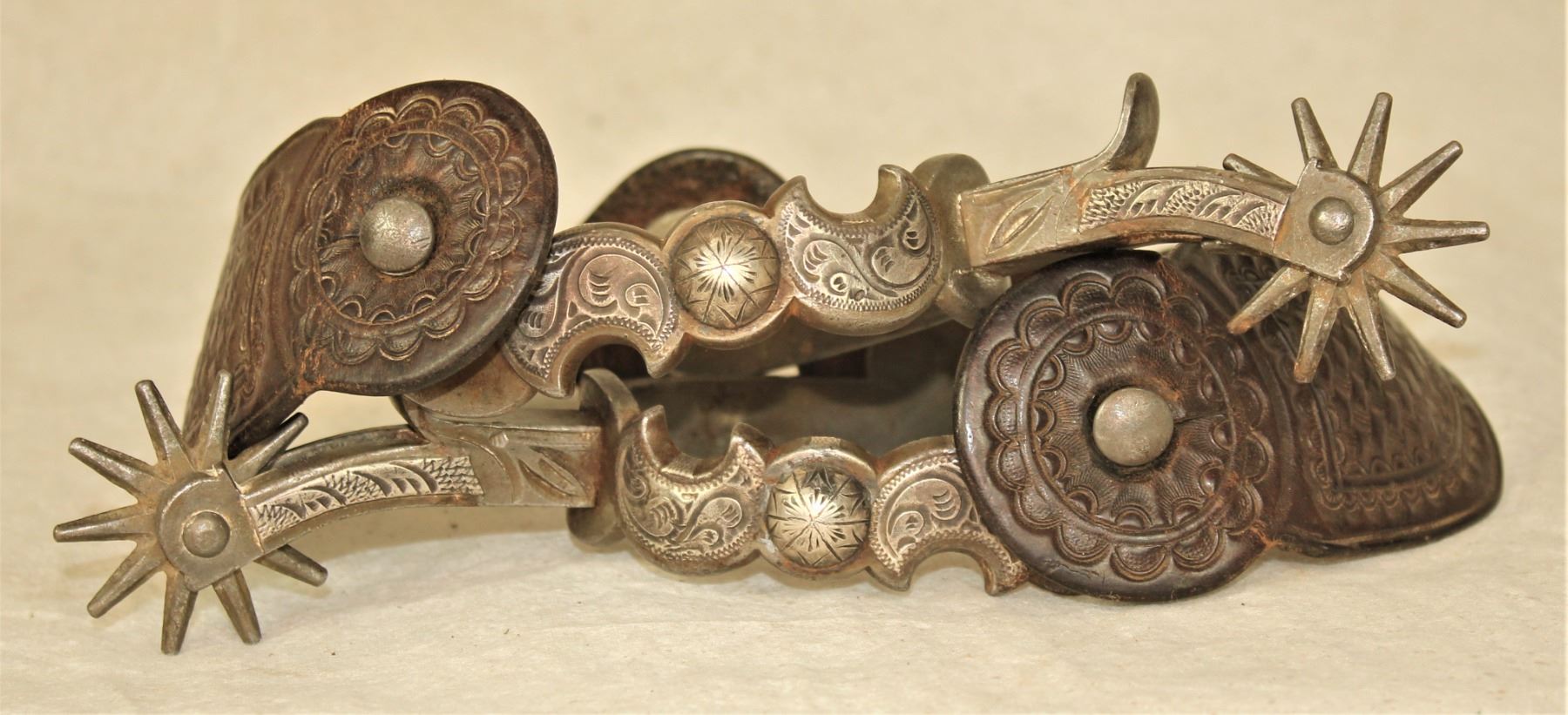 Highly desired early single inlaid double cresent moon pattern spurs with deeply chased iron off-sides, and nice AB Star maker's marks. Finished with great original basket stamped straps. Roger Wilmot Collection
