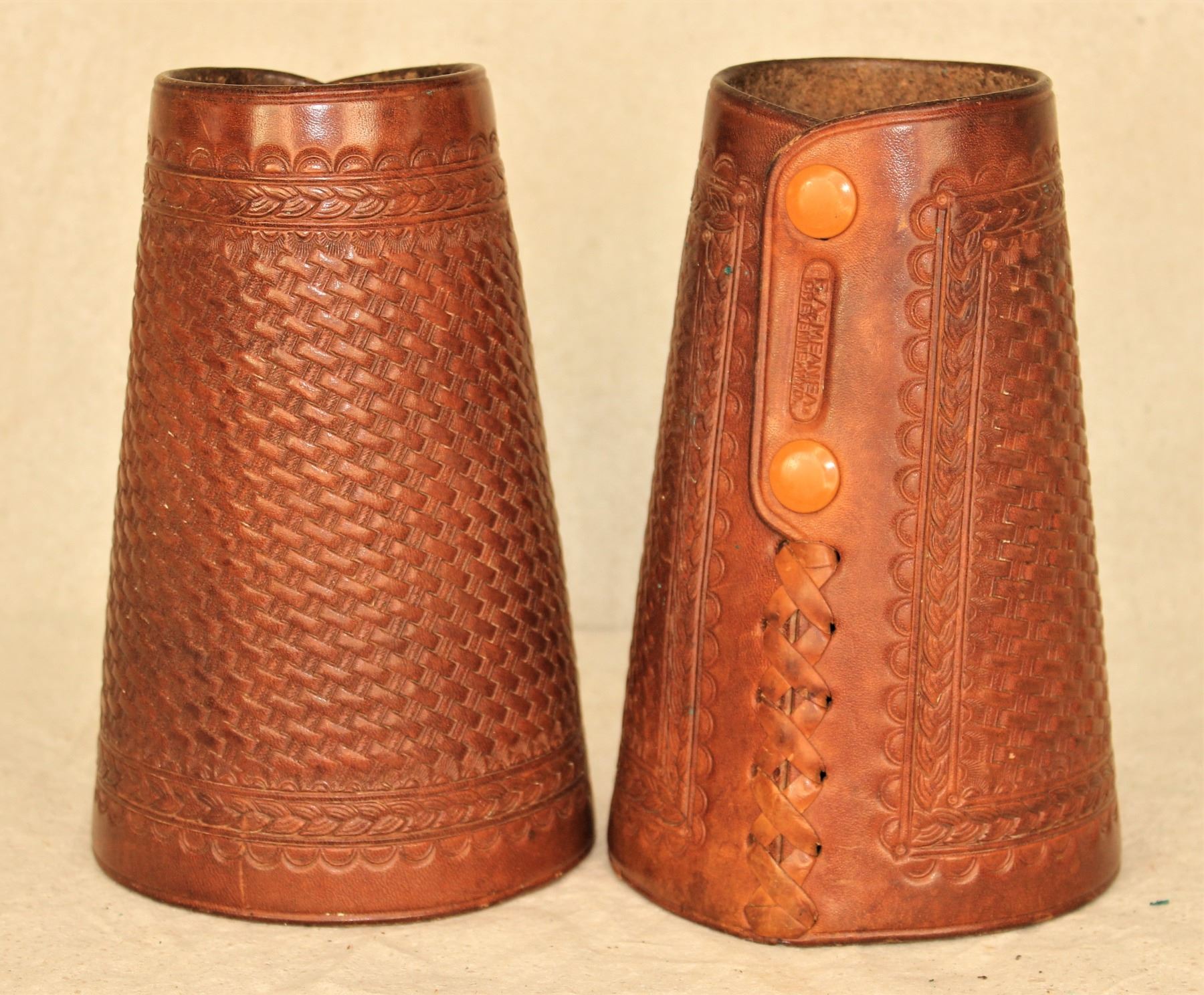 Exceptional light colored pair of large fully basket stamped cuffs with great maker's marks, in near mint condition. Roger Wilmot Collection