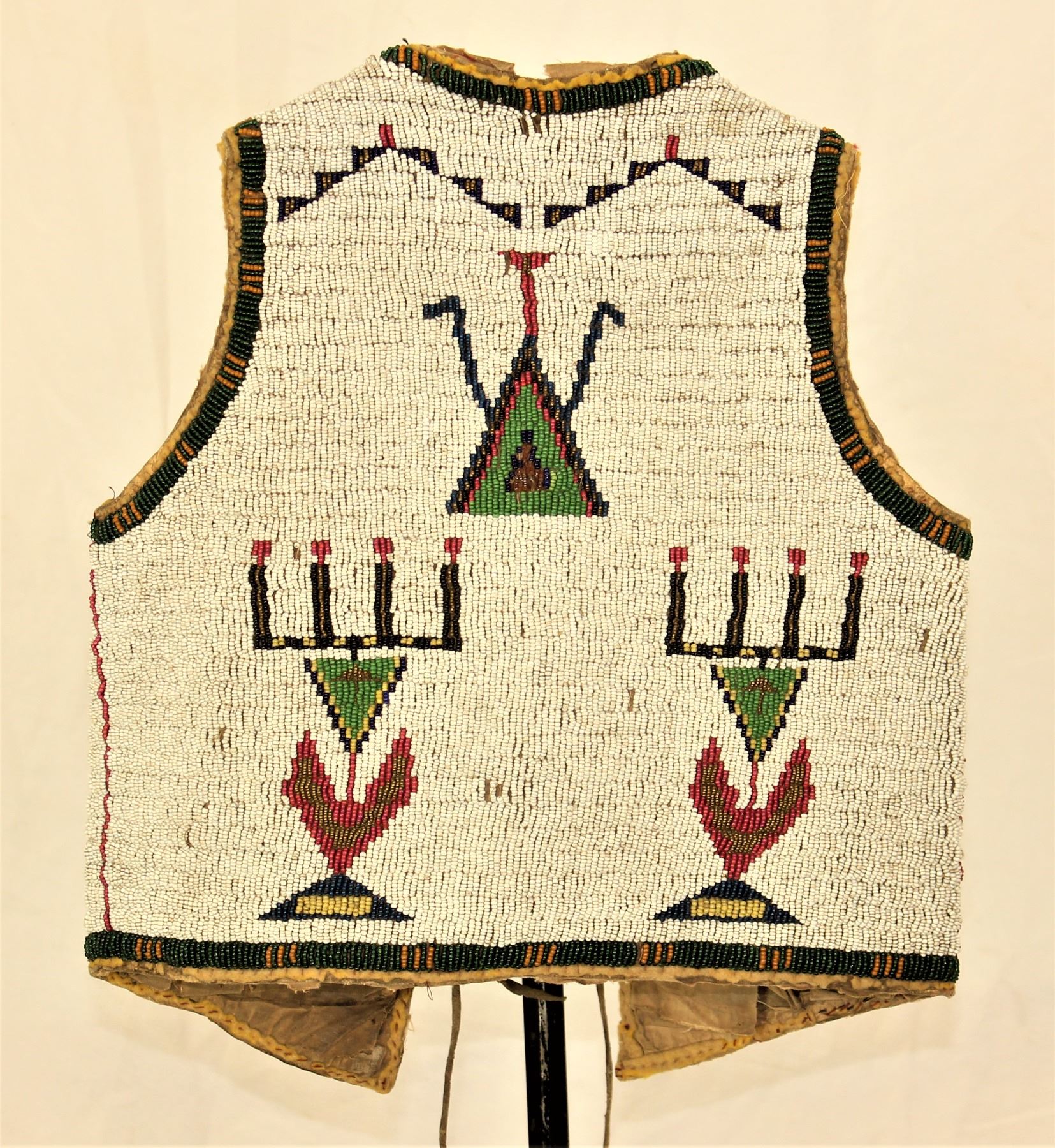 Very nice 19th Century fully beaded youth size vest with detailed geometric designs, showing white background with desirable red white heart and apple green beads.