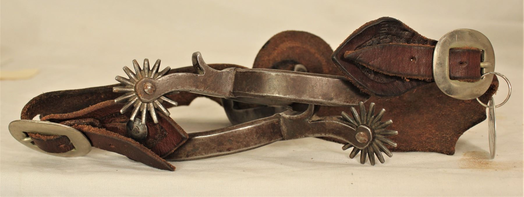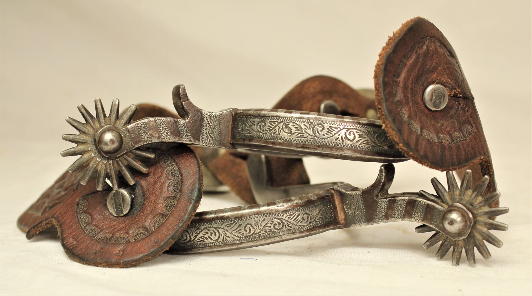 Extremely desirable very dainty single inlaid spurs with great condition, EH marked buttonplates, and original straps. Roger Wilmot Collection