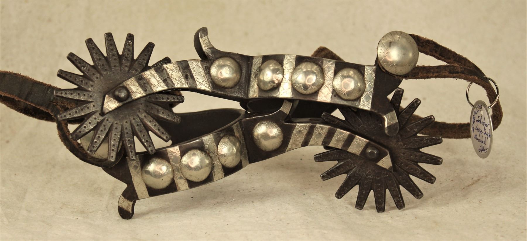 Bold pair of massive single mounted Wyoming spurs with nicely engraved silver domes and bars, accented by an elongated shank and huge 3" classically dotted rowels. Roger Wilmot Collection