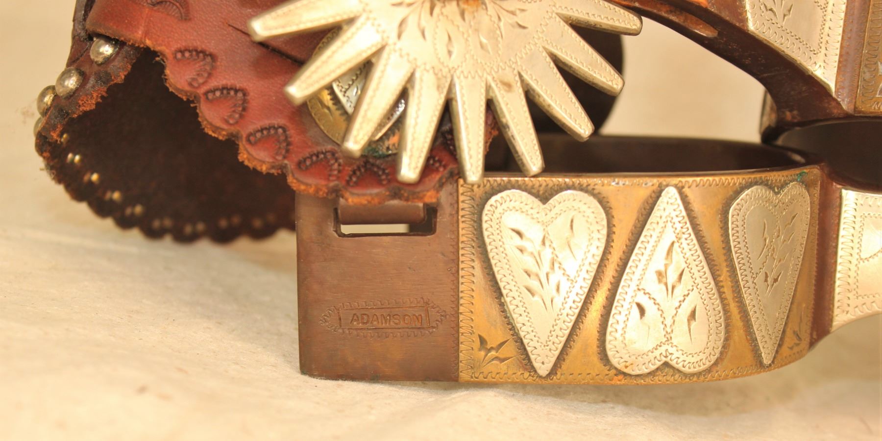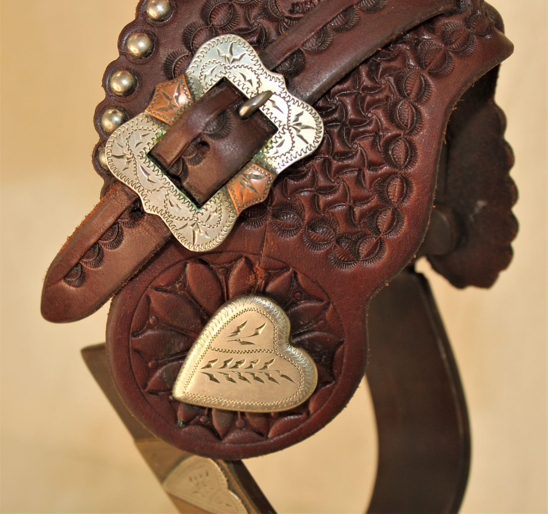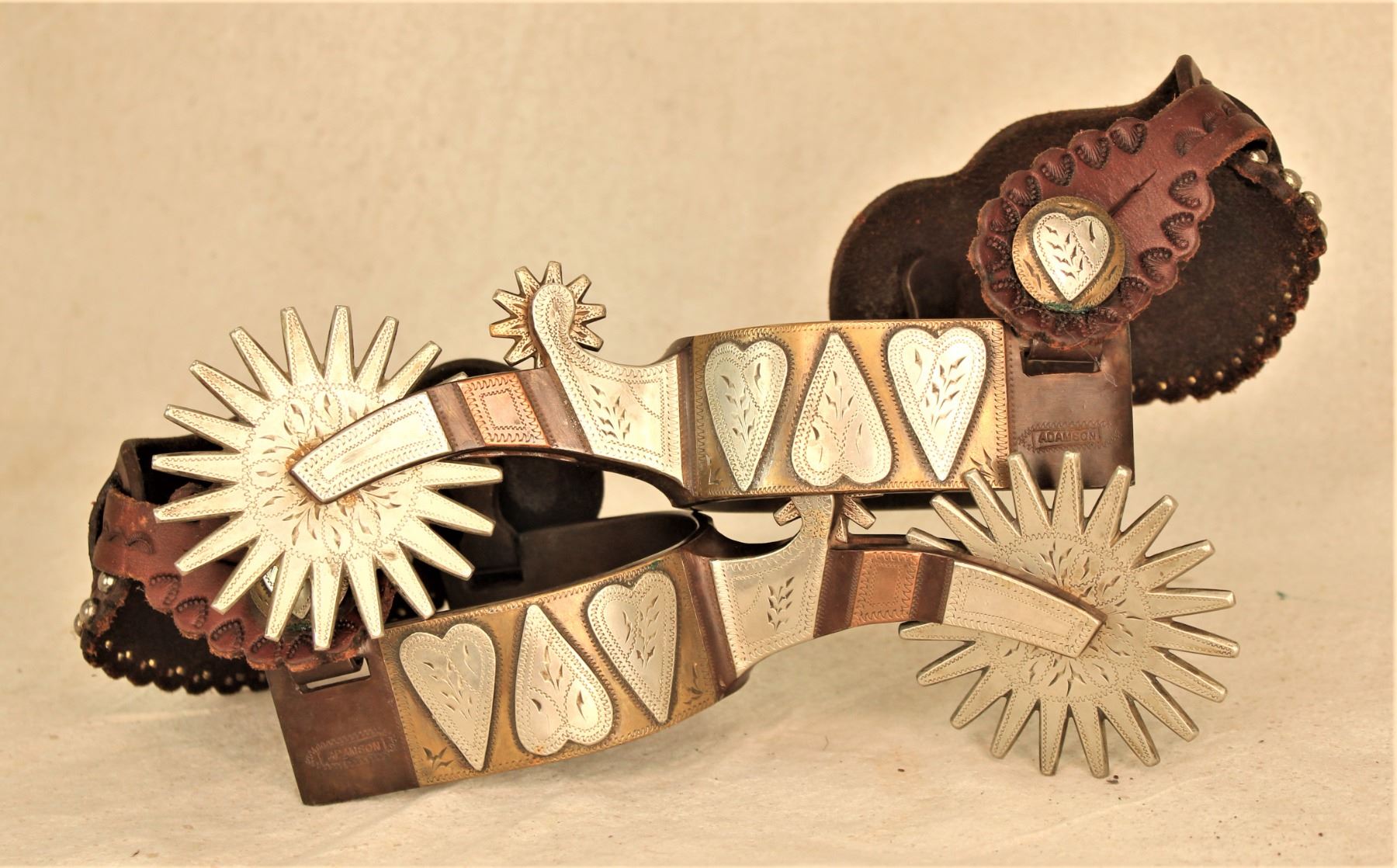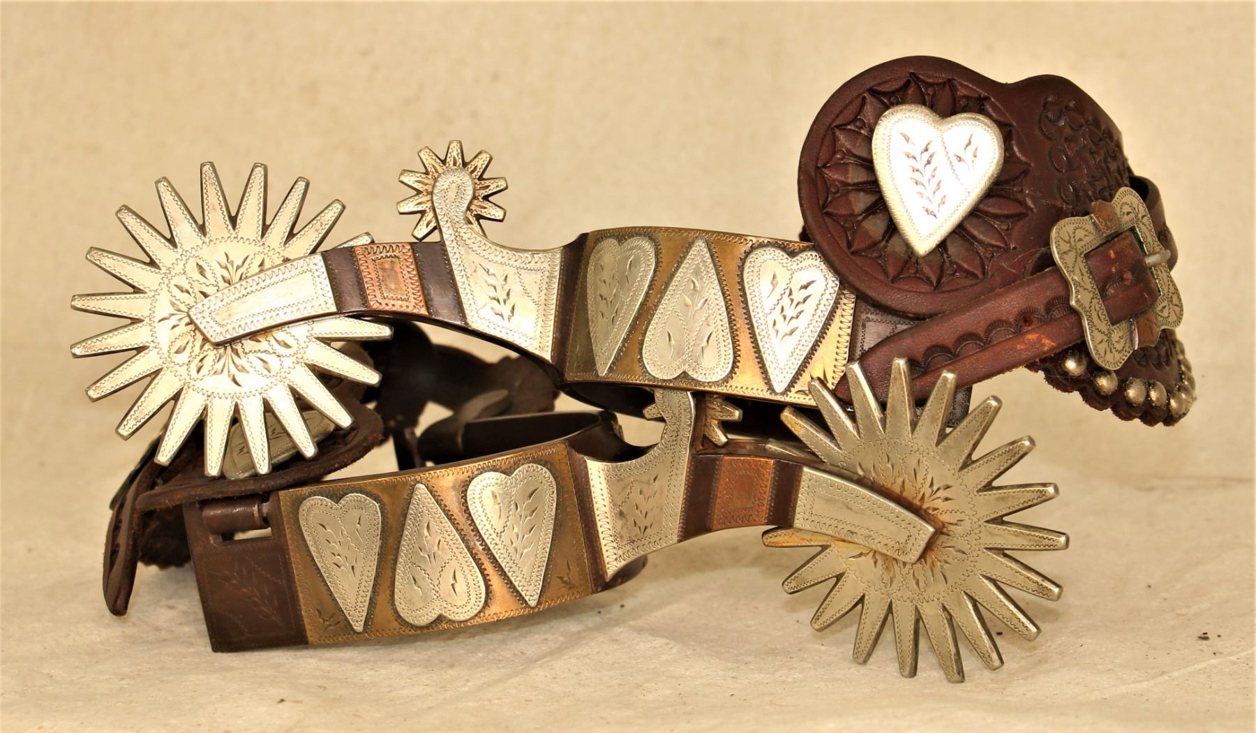 Massive tri-tone double mounted spurs with fantastic four hearts pattern, "Tom Mix" style chap guard, huge engraved rowels, and accented by wonderful Buddy Foster straps with silver buckle sets.