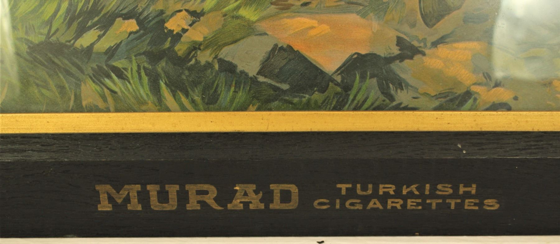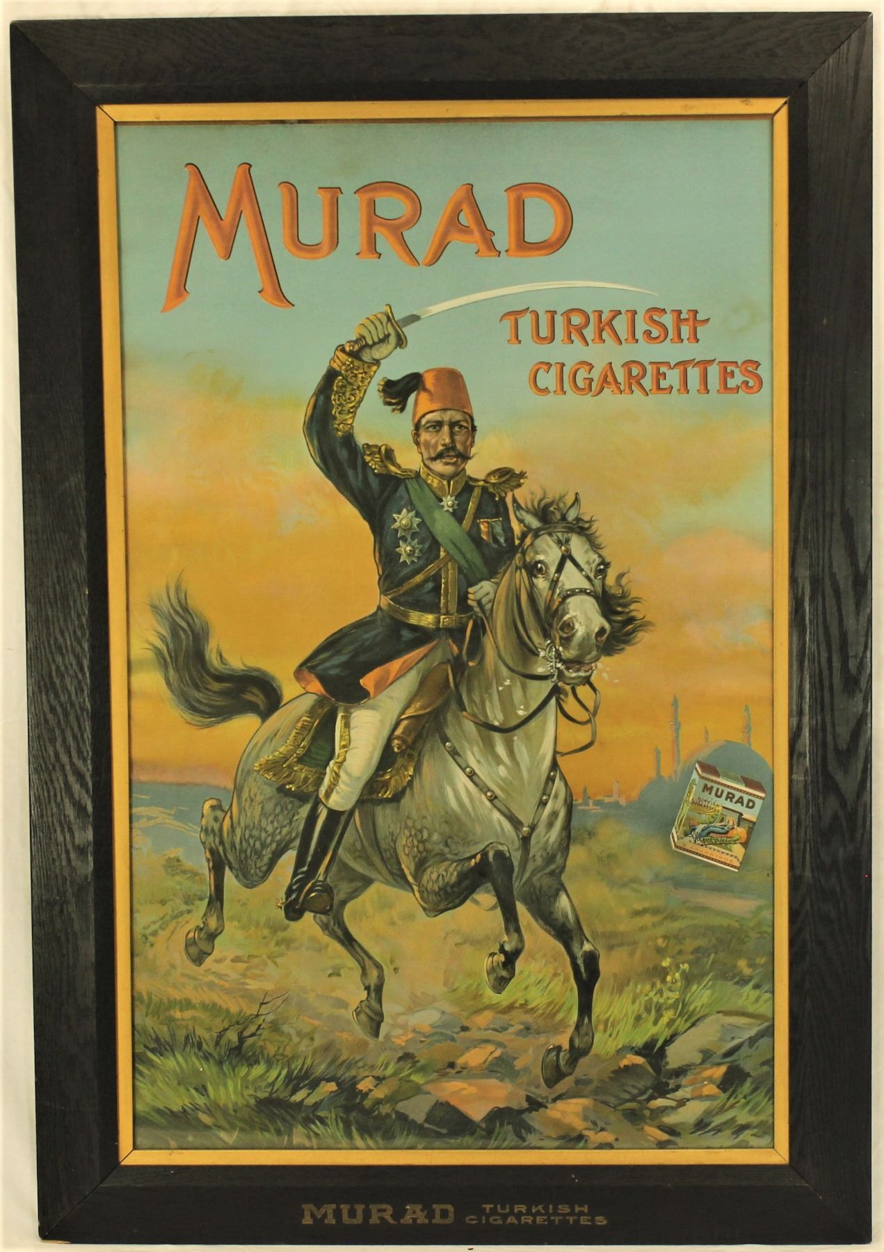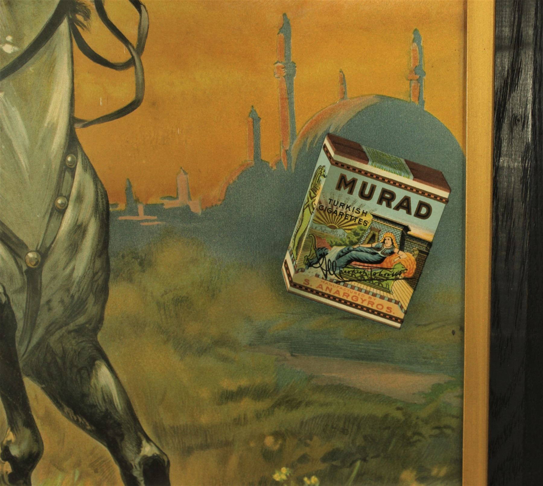 Beautifully presenting large tobacciana advertising lithograph with vivd colors, and great graphics, topped off with a very desirable original frame with "Murad Turkish Cigarettes" stenciled at bottom center. Sight mearurements 22" x 35".