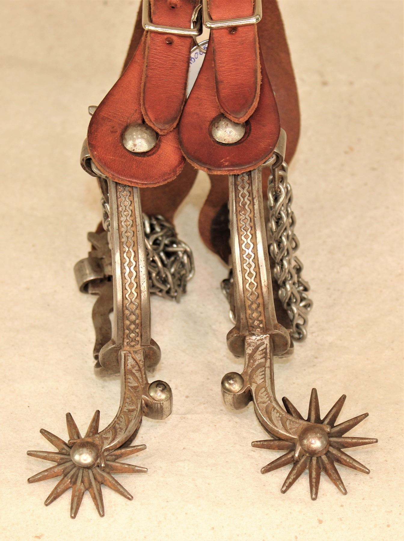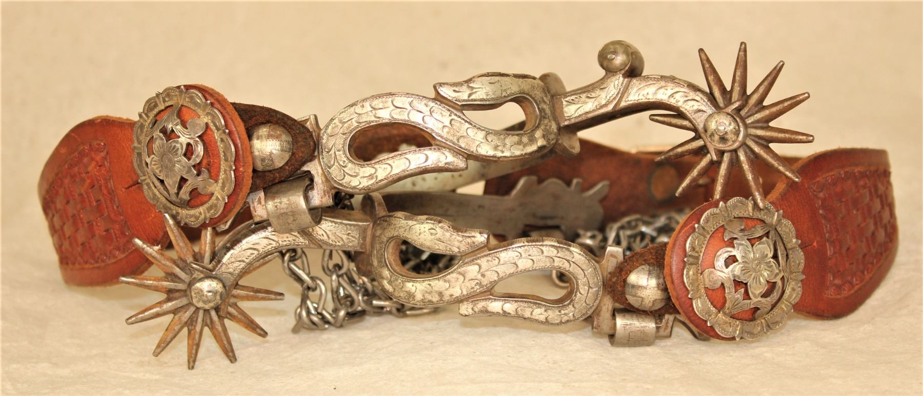 Impressive single inlaid snake spurs with cut-out heelbands, chased iron offsides and buttonplates, and finished with multi-point rowels. Roger Wilmot Collection