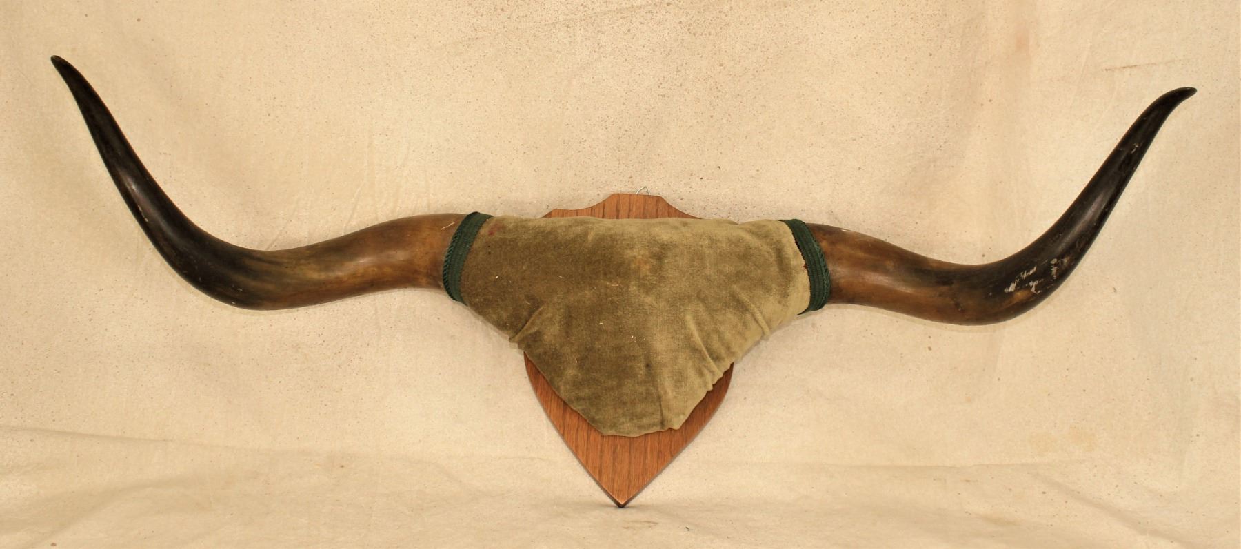 Very nice original wall mount of longhorns with exceptional curl and patina, wrapped in period green velvet, having span of 39".