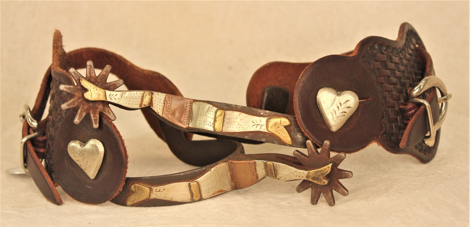 Uncommon single mounted tri-color double gal leg spurs, with large heart buttons. Well marked under the button. Roger Wilmot Collection