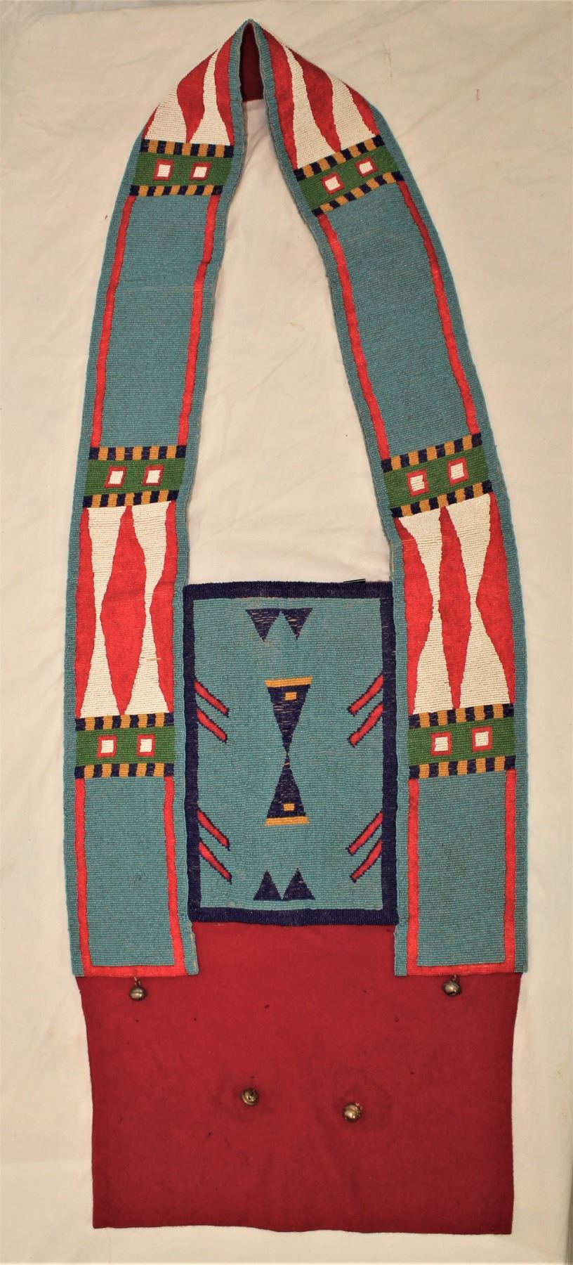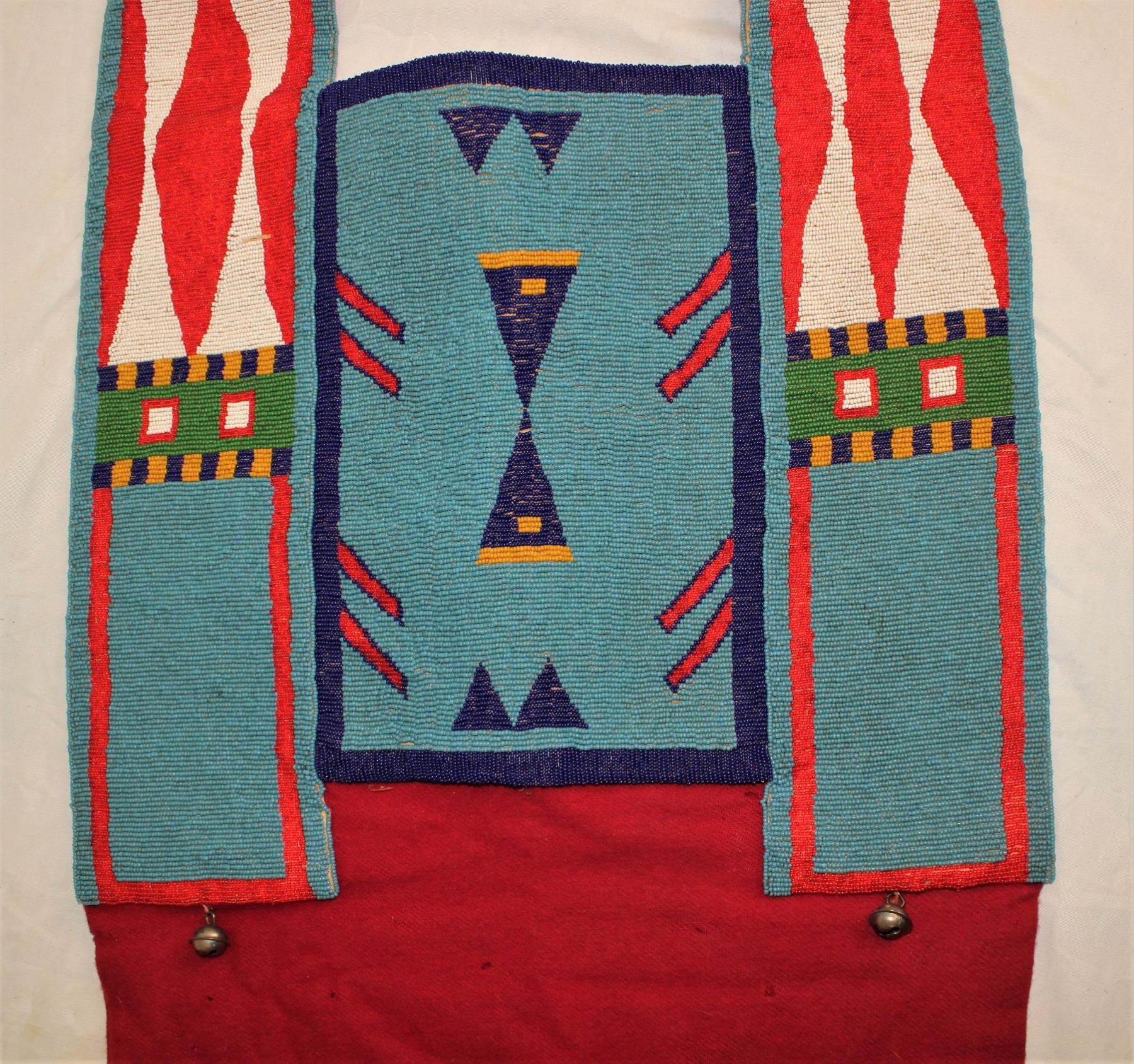 Striking Plateau fully beaded matingale done on trade cloth, with large geometric pattern on robin egg blue background.