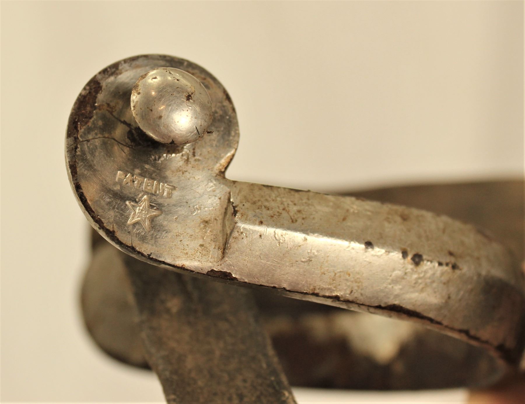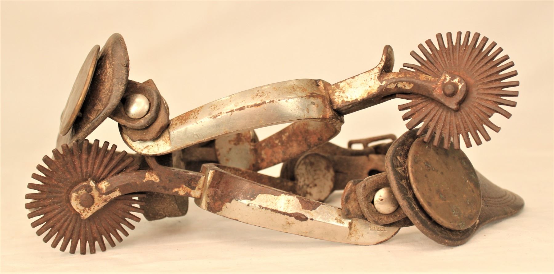 Rare pair of early nickel plated iron spurs with beveled heelbands, radical drop shanks, and massive sawtooth rowels, accompanied by by nice original concho straps.