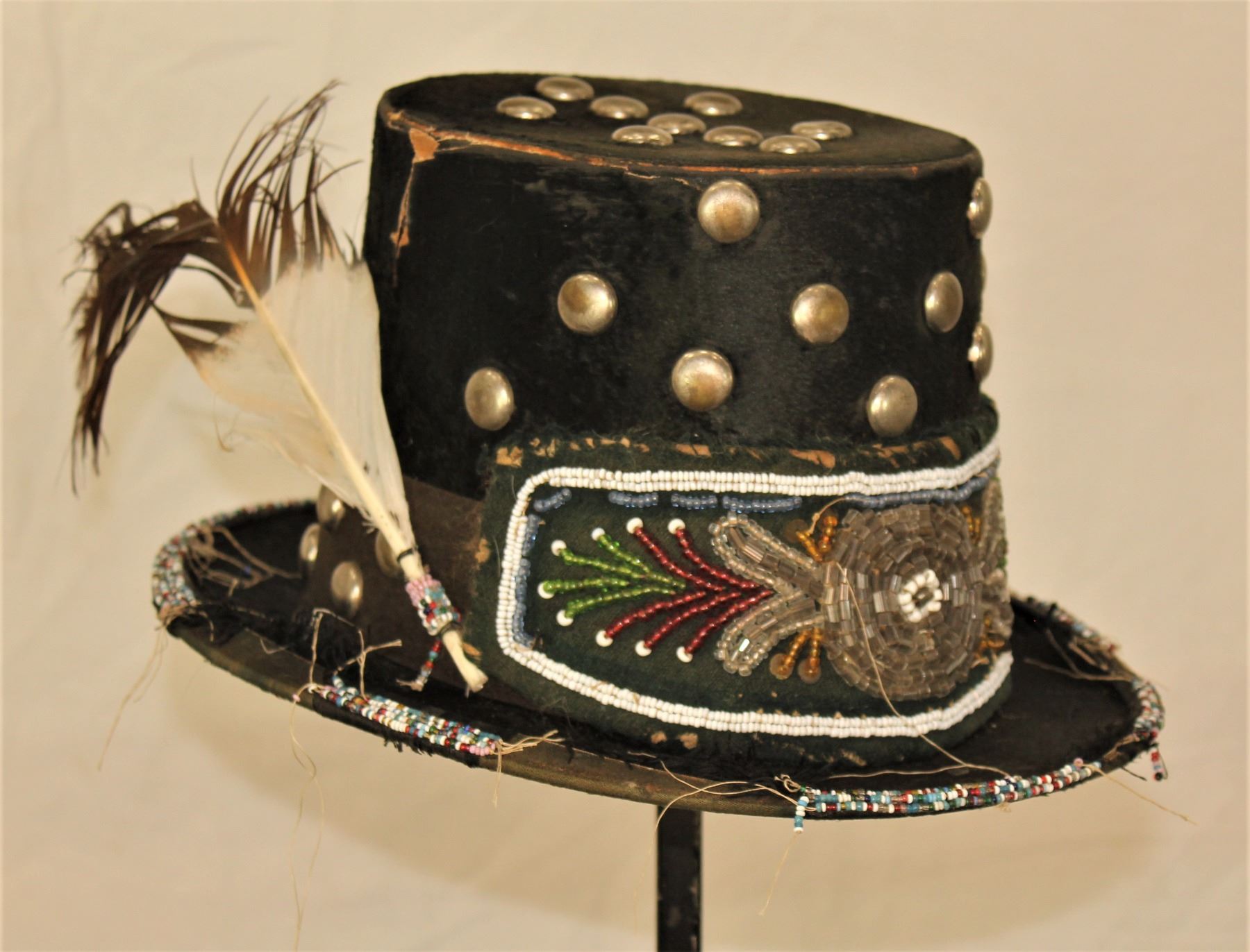 Fantastically decorated Native American top hat done with beadwork and nickel studs.